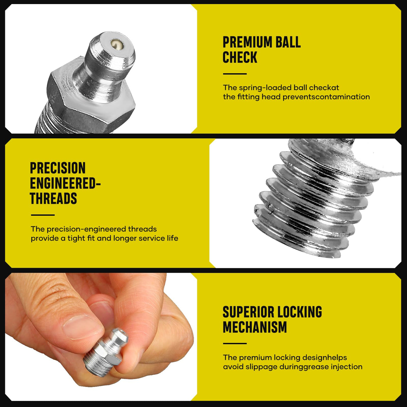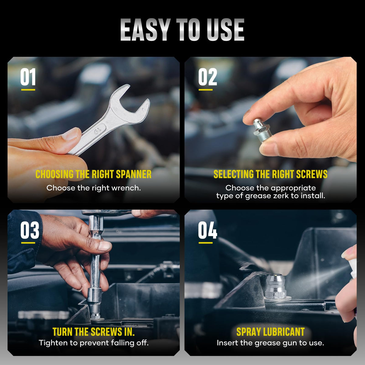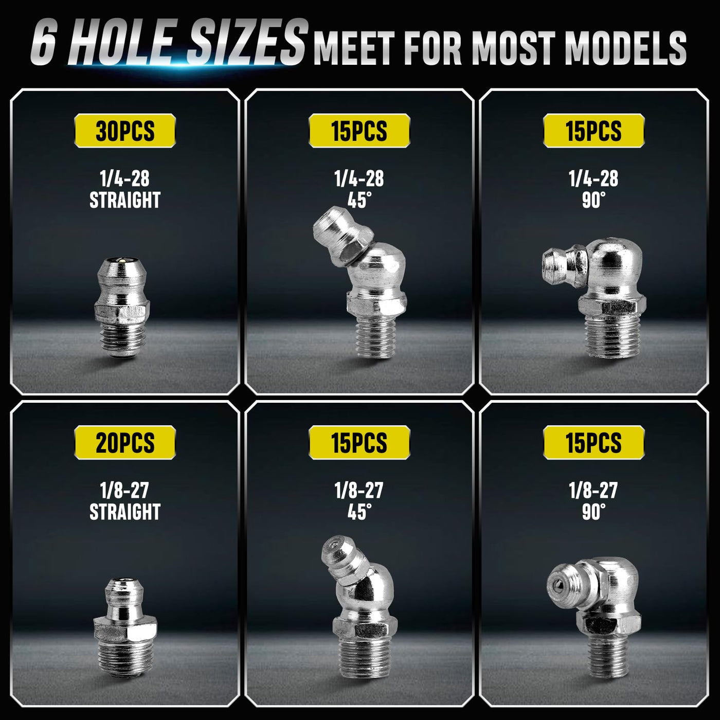 KUBQLIG 110Pcs Grease Fittings Kit, SAE Grease Fitting Assortment: 1/4'' 1/8'' Straight 45 90 Degree Angled Zerk Grease Fittings, Galvanized Steel Grease Zerk Kit for Replacing Broken Grease Fittings ?Specialized Grease Fittings Kit?- KUBQLIG Grease zerk kit are meticulously crafted using high-hardness zinc-plated carbon steel material, ensuring exceptional strength and long-lasting durability. You can rely on the robust construction of these zerk grease fittings to withstand the demands of frequent use; The use of compact and refined grease fittings are not only flexible and convenient, but also makes car maintenance work easier. ?Universal Size, Versatile Applications?- The universal sizes - 30 straight 1/4-28, 20 straight 1/8'' pipe grease, 15 45-degree, 1/4-28 and 15 90-degree 1/4-28 for angled grease guns and more; This assortment kit is perfect for use on cars or vehicles and solves OEM incompatibility issues with straight, 90-degree and 45-degree angled fittings to allow a pressure-resistant connection. ?Practical Functionality and Humanity Packaging?- Grease fittings, sometimes known as Zerks or grease nipples, are small hydraulic check valves used on bearings and similar mechanical assemblies to supply lubricant to internal working parts.The plastic storage case contains each SAE grease zerk fitting in the kit in different compartments with an organization chart to neatly stay organized in your zerk grease fittings collection. ?Note?- These grease zerks feed lubricant into a bearing instead of having to disassemble parts to apply the lubricant, which makes for effective work efficiency when using a grease gun. But before you buy, please make sure that the size range of this grease zerk kit can be used in your vehicle. ?WHAT YOU GET?- KUBQLIG 110Pcs Grease Fitting Assortment and lifetime after-sales service, to provide customers with simple and beautiful and quality products has always been the original intention of our business, do not need to worry about! locking straight 45 90 degree drive in self tapping metric small bearing zerk zerks buster grease nipple gun guns case tips tip fittings fitting assortment attachments accessory parts kit adapter tool tools holder coupler cap maquinaria nozzle swivel