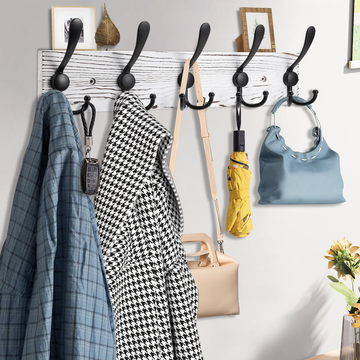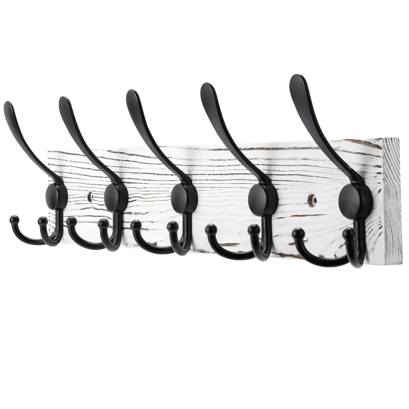 Kuhome Coat Rack Wall Mount Wooden Hat Rack For Wall Hooks Pine Real Wood Plank 16.9' White Coat Hanger With 5 Black Triple Hooks For Hanging Coat Hat Jacket