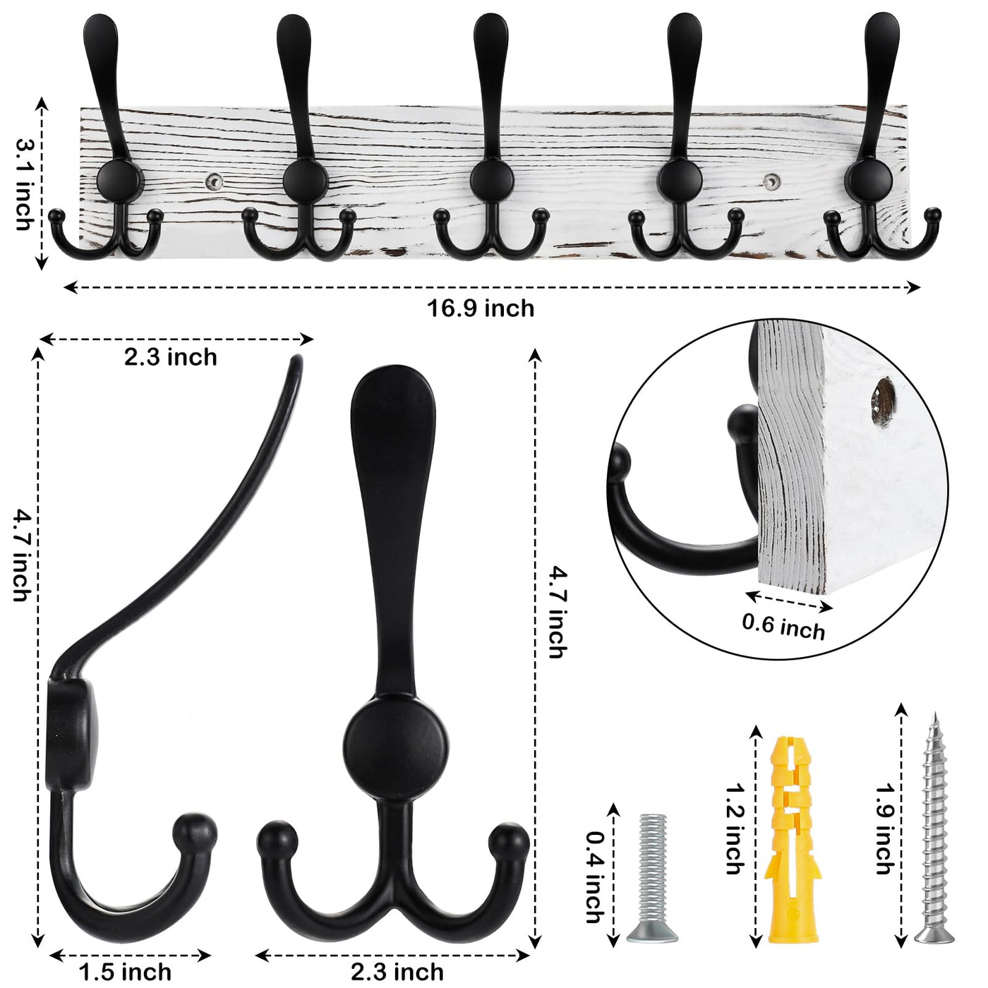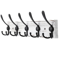 Kuhome Coat Rack Wall Mount Wooden Hat Rack for Wall Hooks Pine Real Wood Plank 16.9' White Coat Hanger with 5 Black Triple Hooks for Hanging Coat Hat Jacket
