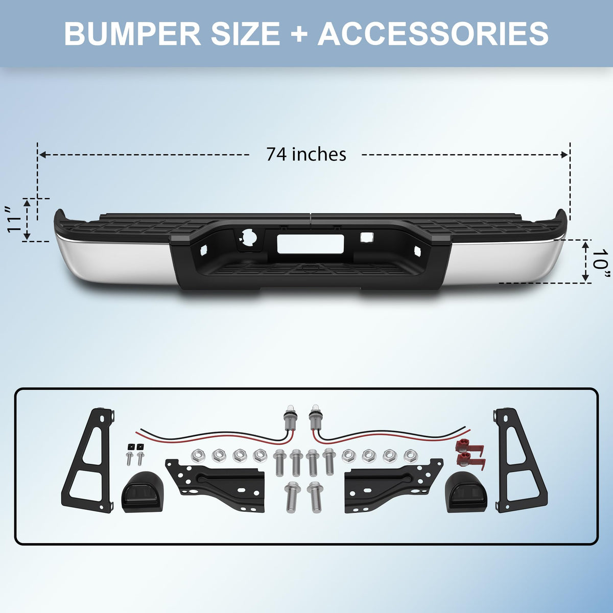 [Fit for Following Vehicles] -- The Chrome Rear bumper Compatible for 2007-2013 Chevy Chevrolet Silverado 1500, Compatible for 2007-2013 GMC Sierra 1500, exclude Silverado/Sierra 2500 3500 model (notes: Fit For without Rear Park Assist Sensor Holes Models Only) | [Product Detail] -- Part number: Compatible for 22932803, GM1103147. Package List: 1X Rear Bumper, Includes mounting hardware Materials. direct replacement, no modifications, drilling or cutting are required | [Advantages] -- The bumper made of superior steel and ABS plastic, which is designed to fit your vehicle perfectly, provides effective protection in the event of a sudden collision, anti-rust and anti-corrosion process makes the bumper more durability and have a long-lasting | [Function] -- The KUIPERAUTO bumper to protect your body from the harsh environment and sudden collision, making your travel more reassuring, and which have a very stylish and practical appearance | [Notes] -- Please double check the compatibility chart and model description before your purchasing,If you have any questions or problems, please contact us