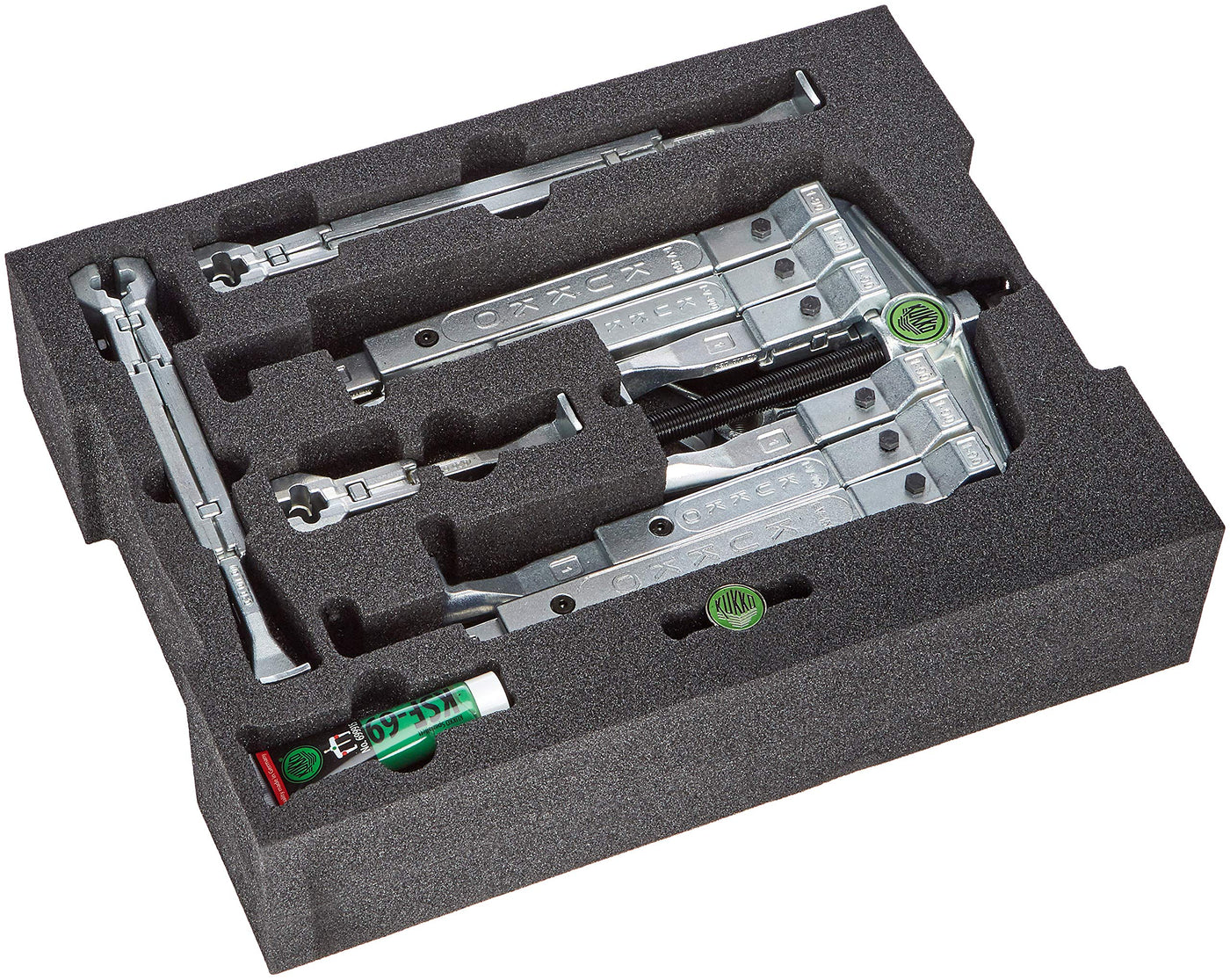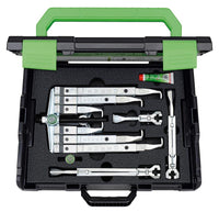 Q: Is the Kukko 8496076 suitable for both 2 and 3 jaw setups?A: Yes, the Kukko 8496076 is designed as a universal bearing puller set that can be used with both 2 and 3 jaw configurations for increased versatility.