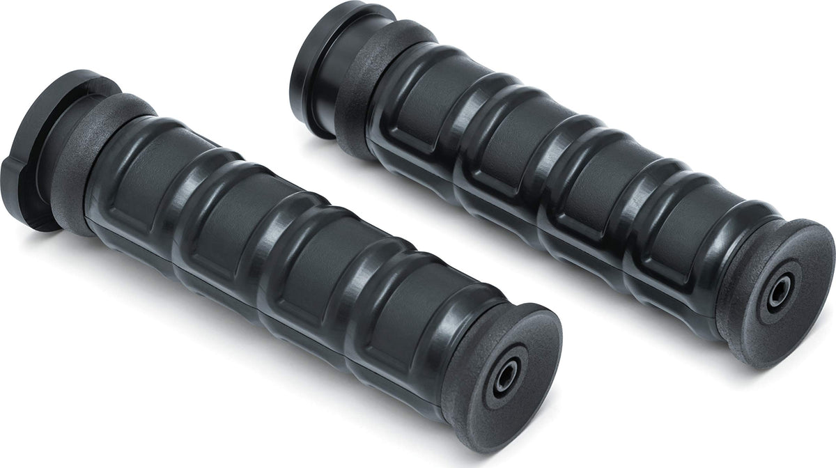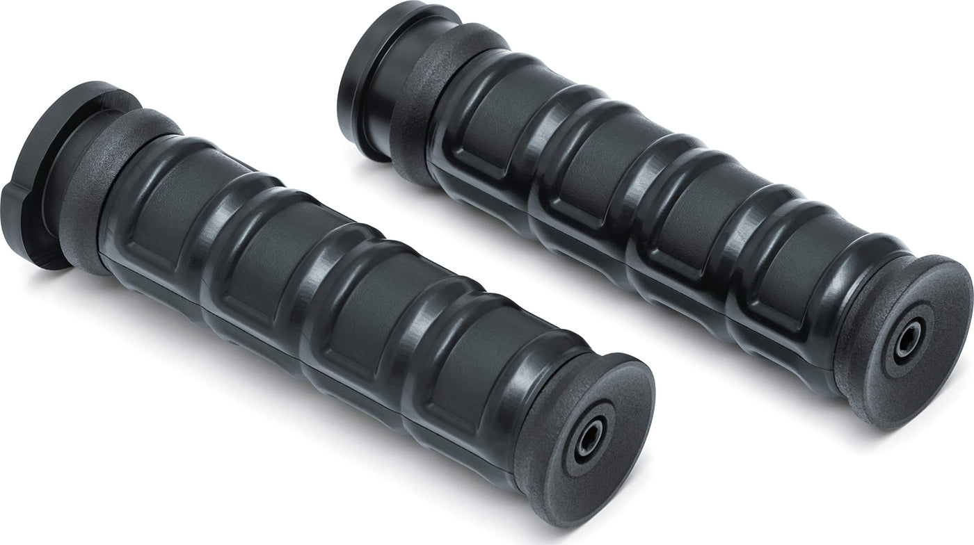 The Kuryakyn 6675 Dillinger grips combine a narrow profile with ribbed EPDM rubber for aggressive grip, commanding control and a soft, vibration-dampening foundation to combat hand and forearm fatigue. Features aluminum collars and removable end caps for use and installation of bar-end mirrors, turn signals or weights. For use alone or in coordination with Kuryakyn Dillinger accessories for a cohesive look to your motorcycle. Includes (1) satin black clutch side grip and (1) satin black throttle side grip; suggested for installation (not included): set of torx wrenches, set of hex wrenches, utility knife, 80-100 grit sandpaper, and adhesive solvent. The Kuryakyn 6675 Dillinger grips are compatible with electronic throttle control on Harley-Davidson models: '08-'19 (excludes '18-'19 FLTRXSE).