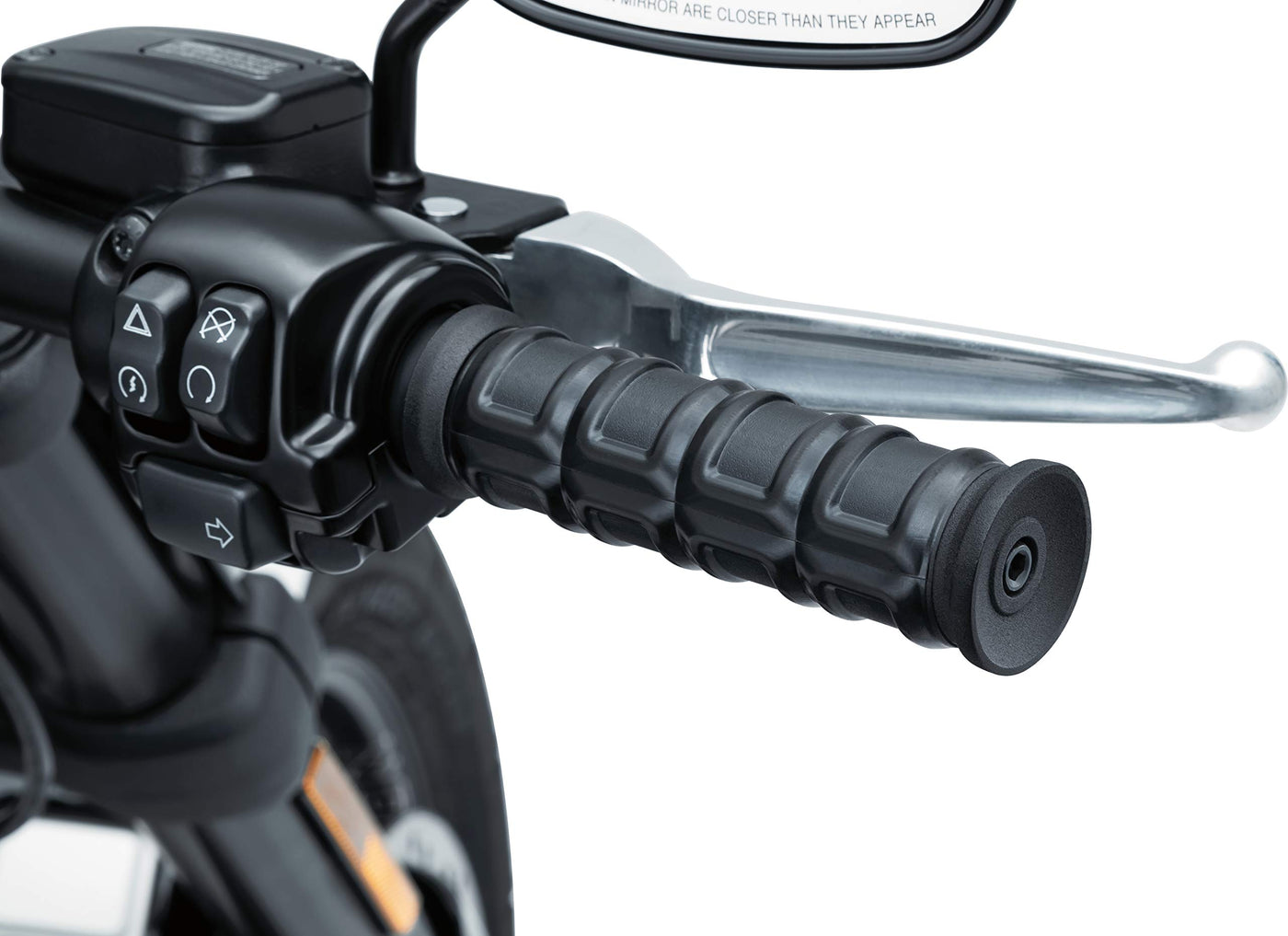 The Kuryakyn 6675 Dillinger Grips Combine A Narrow Profile With Ribbed Epdm Rubber For Aggressive Grip, Commanding Control And A Soft, Vibration-Dampening Foundation To Combat Hand And Forearm Fatigue. Features Aluminum Collars And Removable End Caps For Use And Installation Of Bar-End Mirrors, Turn Signals Or Weights. For Use Alone Or In Coordination With Kuryakyn Dillinger Accessories For A Cohesive Look To Your Motorcycle. Includes (1) Satin Black Clutch Side Grip And (1) Satin Black Throttle Side Grip; Suggested For Installation (Not Included): Set Of Torx Wrenches, Set Of Hex Wrenches, Utility Knife, 80-100 Grit Sandpaper, And Adhesive Solvent. The Kuryakyn 6675 Dillinger Grips Are Compatible With Electronic Throttle Control On Harley-Davidson Models: '08-'19 (Excludes '18-'19 Fltrxse).