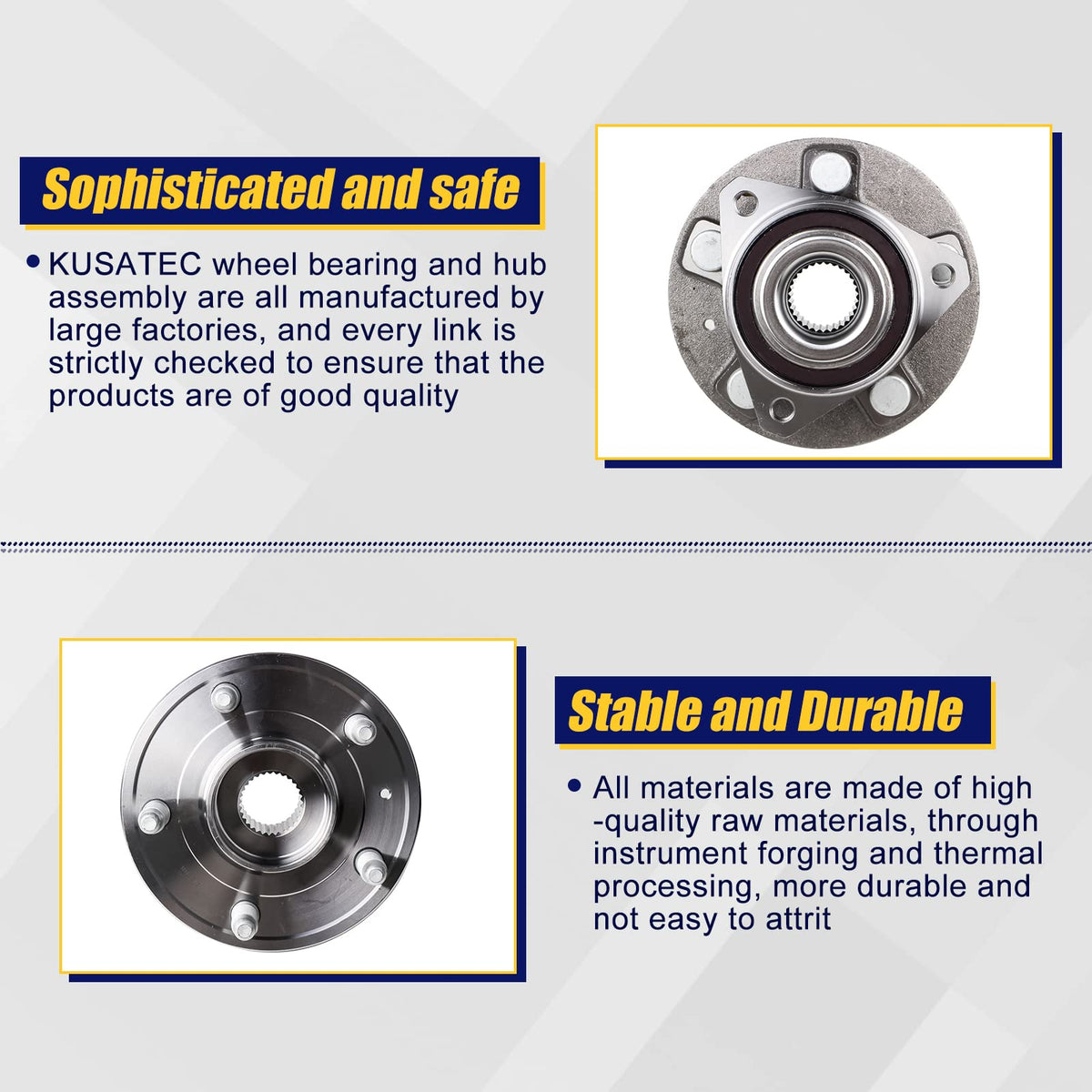 Q: What materials are used in the KUSATEC Wheel Hub and Bearing Assembly?A: The KUSATEC 513288 Wheel Hub and Bearing Assembly is made from high-quality bearing steel, which ensures durability and resistance to rust and corrosion. The bolts have a protective coating to enhance longevity.