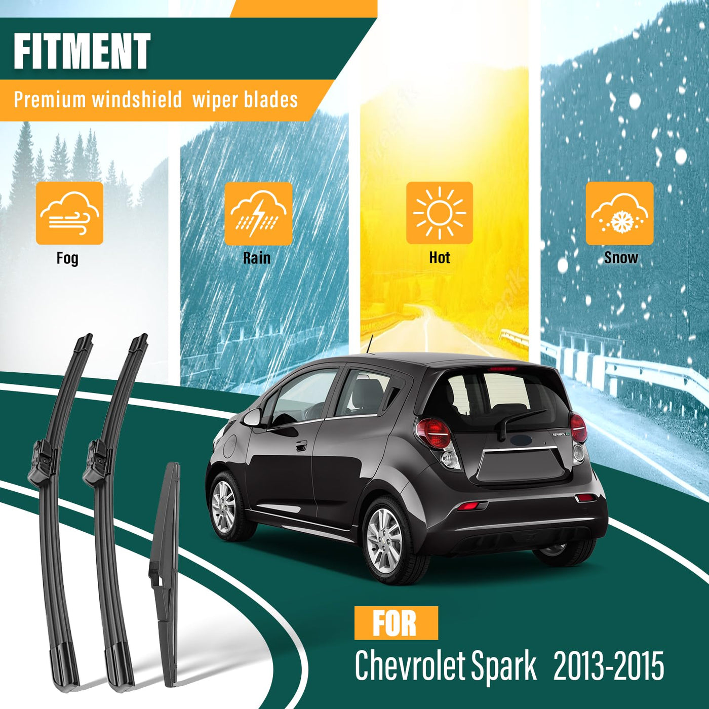 Q: What vehicles are compatible with the KVQ Windshield Wiper Blades?A: The KVQ Windshield Wiper Blades are specifically designed as a replacement for the 2013, 2014, and 2015 Chevy Chevrolet Spark models.