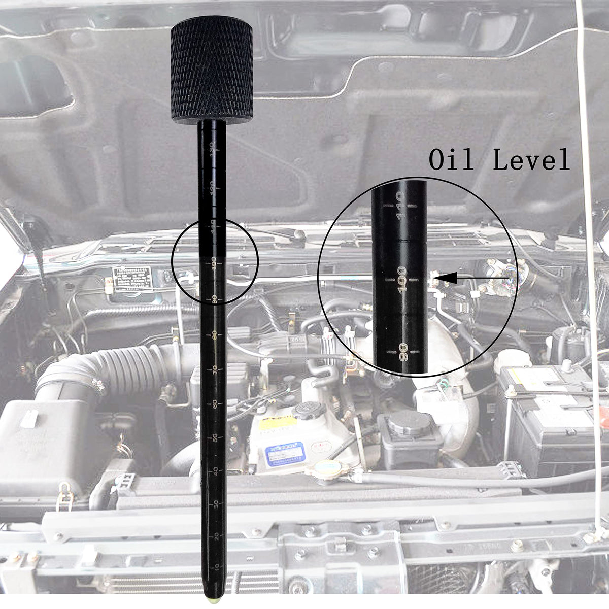 Q: What is the material and build quality of the kweiny Transmission Dipstick?A: The kweiny Transmission Dipstick is made from low-carbon steel with a black anodized surface, ensuring durability and resistance to corrosion. The dipstick features a knurled handle for a secure grip, making it easy to use.