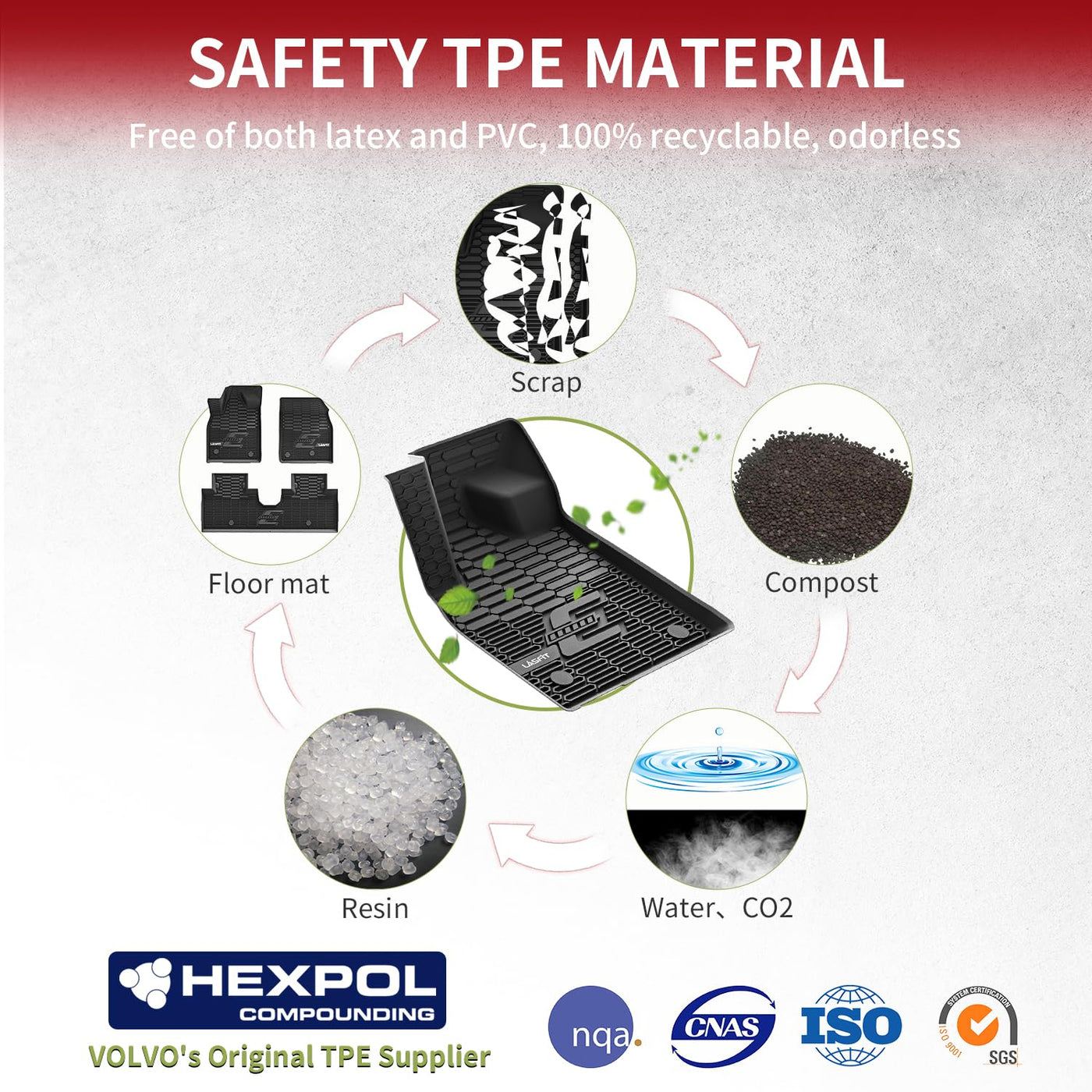 Q: What material are the LASFIT floor mats made from?A: The LASFIT floor mats are made from high-quality Thermoplastic Elastomer (TPE), which is environmentally friendly, flexible, and durable for all weather conditions.