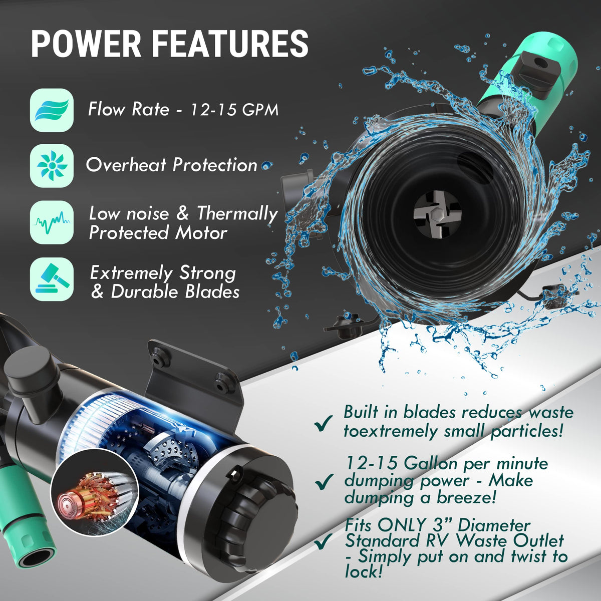 Q: How does the LATCH.IT RV Macerator Pump work?A: The LATCH.IT RV Macerator Pump operates by using a 12V DC motor that efficiently grinds waste down to 1/8 inch particles, allowing for easy pumping of up to 12-15 gallons of waste per minute through a 3-inch diameter outlet.