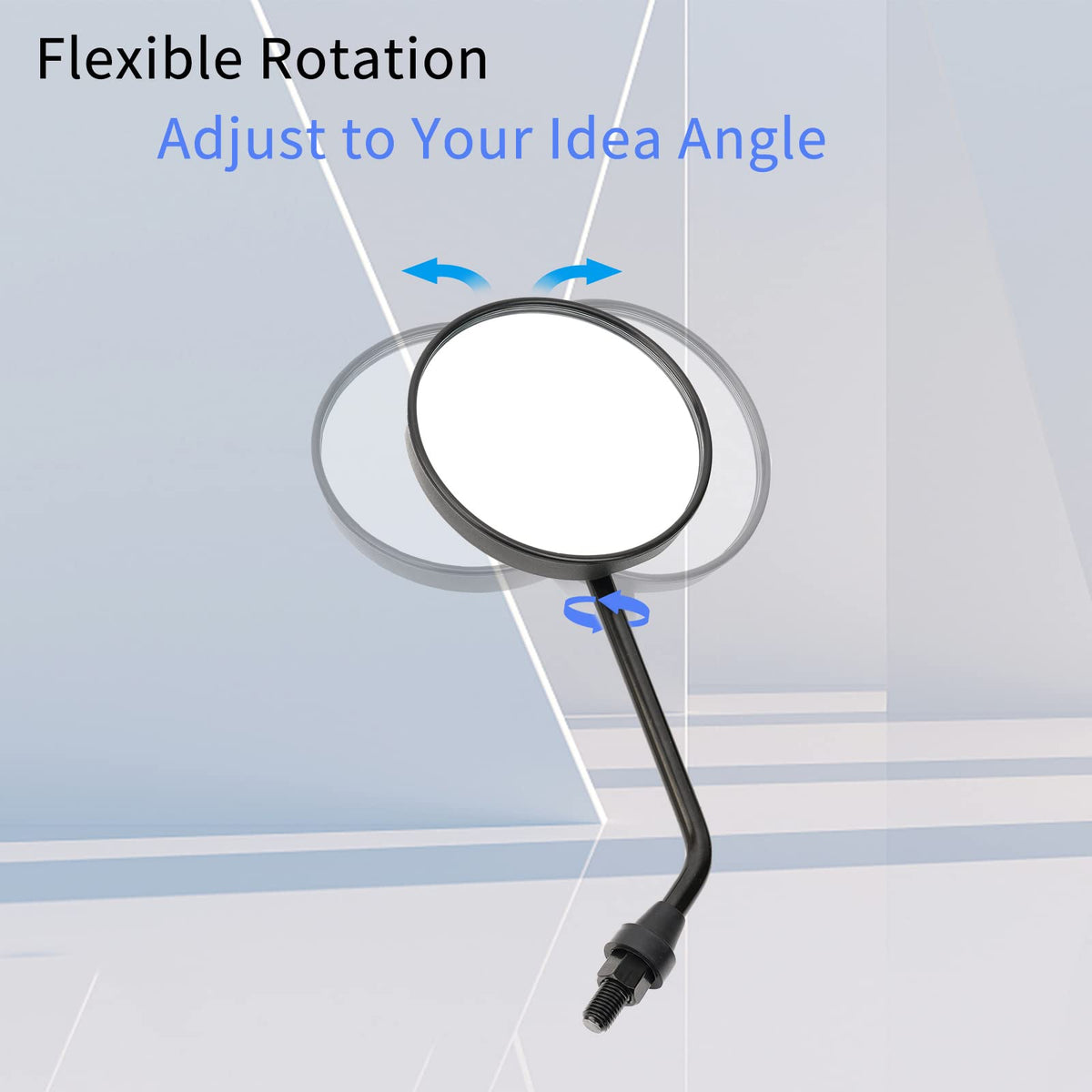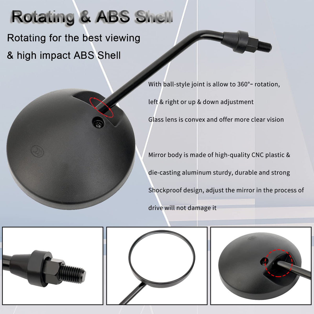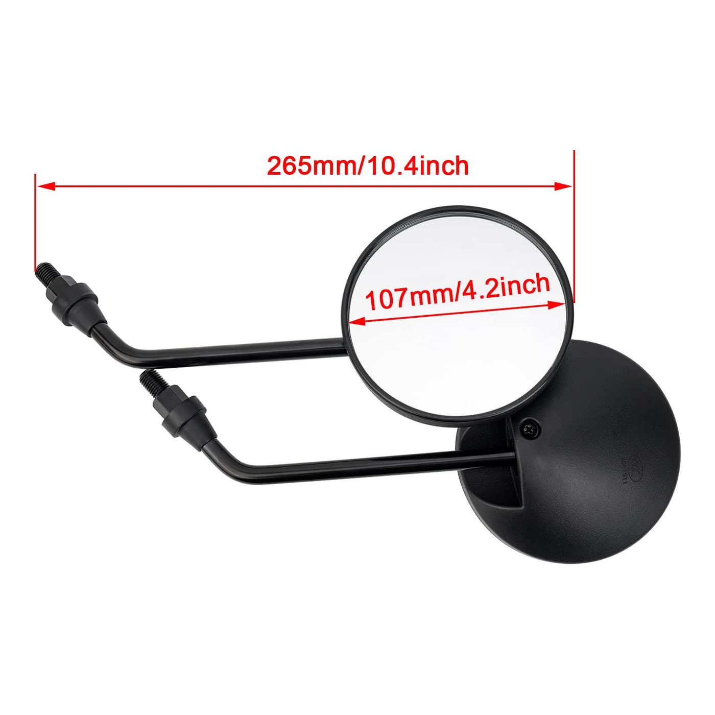 Product Description: product:Motorcycle Rearview Mirror Performance: 1. Simple and retro design. 2. Bend stem gives a custom look. 3. E-mark approved. 4. Easy installation. 5. adjustable ball joint; Unique ball joint, easily adjust the mirror plate. 6. TOP QUALITY DESIGN AND MANUFACTURING: manufactured in China. Made with durable ABS plastic body, Polycarbonate (PC) glass mirror, and steel mounting bolt for secure installation. Compatible with 10mm Universal Motorcycle Rearview Mirror Handle Bar End Side Round Mirrors Aluminum for Honda Suzuki Yamaha Kawasaki Motorcycle Side Mirror 3.94'' Round Rearview Mirror with 10mm Bolt Motorcycle 3.94'' Round Rearview Mirror Retro Round CNC Rearview Mirror Universal 10mm Clear Rear View Side Mirror Fit for Cross Bones 2008-2009 Dyna 1984-2014 Electra Glide 1990-2014 Heritage Softail 1990-2014 Iron 883 2009-2014 Night; Rod 2006-2008 Road Glide 1998-2013 Road King 1994-2014 Rocker 2008-2009 Rocker C 2008-2009 Softail 1990-2014 Sportster 1200 1990-2014 Sportster 883 1990-2013 Street Glide 2006-2014 Package includes: 1 pair Rearview Mirror Note: If you are not sure whether your model is suitable for our products, please contact us, we will provide you with the most sincere service!