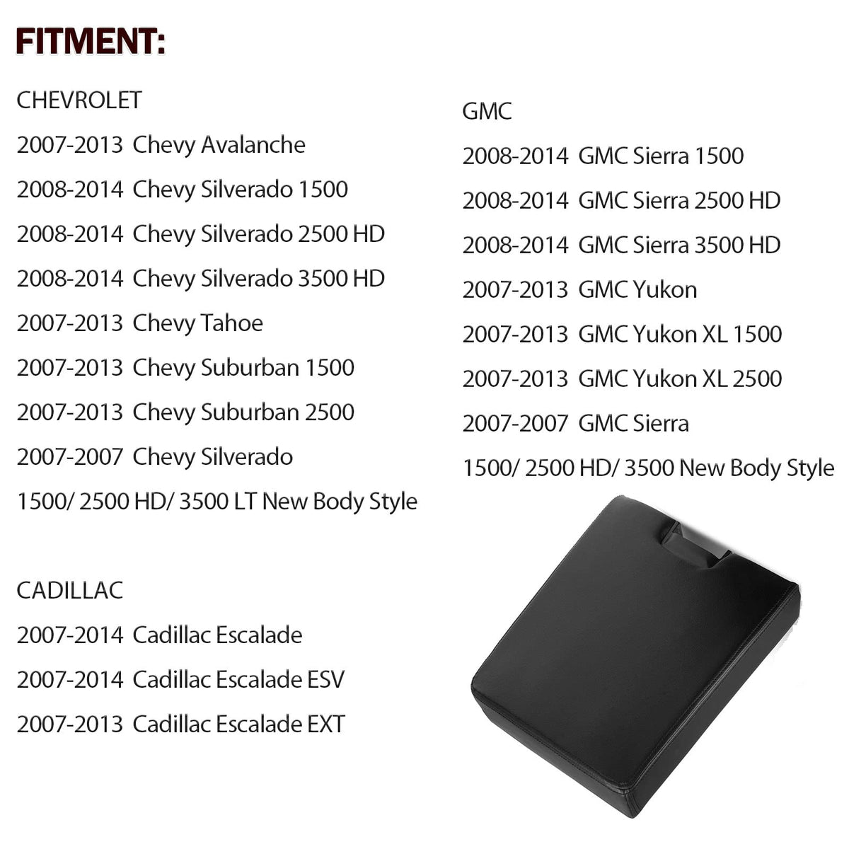 Q: What vehicles are compatible with the LCWRGS Center Console Lid?A: The LCWRGS Center Console Lid is compatible with a variety of vehicles, specifically the 2007-2013 Chevy Avalanche, 2008-2014 Chevy Silverado 1500, 2500HD, 3500HD, 2007-2013 Chevy Tahoe, 2007-2013 Suburban 1500 and 2500, as well as the 2008-2014 GMC Sierra 1500, 2500HD, 3500HD, and several models of GMC Yukon and Cadillac Escalade.