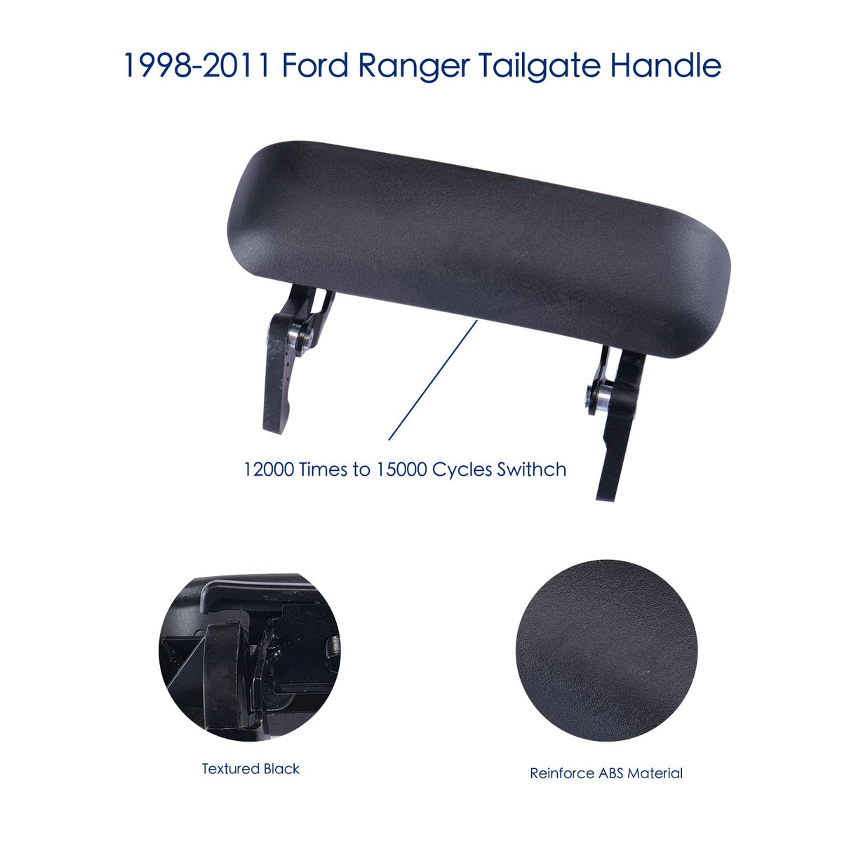 Compatible with Ford Ranger Fitment Details: 2010-2011 Base Cab & Chassis 2-Door 2008 Base Standard Cab Pickup 2-Door 2001-2005 Edge Standard & Extended Cab Pickup 2-Door 2001-2004 Edge Extended Cab Pickup 4-Door 2003 Edge Stripped Chassis 1998-2002 EV Standard Cab Pickup 2-Door Electric 2005-2009 FX4 Extended Cab Pickup 2-Door 2006-2009 FX4 Extended Cab Pickup 4-Door 2005 FX4 Standard Cab Pickup 2-Door 2006-2010 Limited Crew Cab Pickup 4-Door 1998 Splash Extended Cab Pickup 2-Door & 4-Door 1998 Splash Standard Cab Pickup 2-Door 2006-2011 Sport Extended Cab Pickup 2-Door & 4-Door 2006-2009 Sport Standard Cab Pickup 2-Door 2006-2007 STX Extended Cab Pickup 2-Door & 4-Door 2006-2007 STX Standard Cab Pickup 2-Door 2004 Tremor Extended Cab Pickup 2-Door & 4-Door 2003-2006, 2008, 2010-2011 XL Crew Cab Pickup 4-Door 1998-2011 XL Extended Cab Pickup 2-Door 1998-2003 XL Extended Cab Pickup 4-Door 1998-2011 XL Standard Cab Pickup 2-Door 2001-2003 XL Stripped Chassis 2005-2008, 2010-2011 XLT Crew Cab Pickup 4-Door 1998-2011 XLT Extended Cab Pickup 2-Door & 4-Door 1998-2011 XLT Standard Cab Pickup 2-Door 2003 XLT Stripped Chassis Package Includes: 1 Pc Tailgate Handle Liftgate Latch Handle Location: Fits Tailgate Door Handles Finish: Textured Black, Plastic
