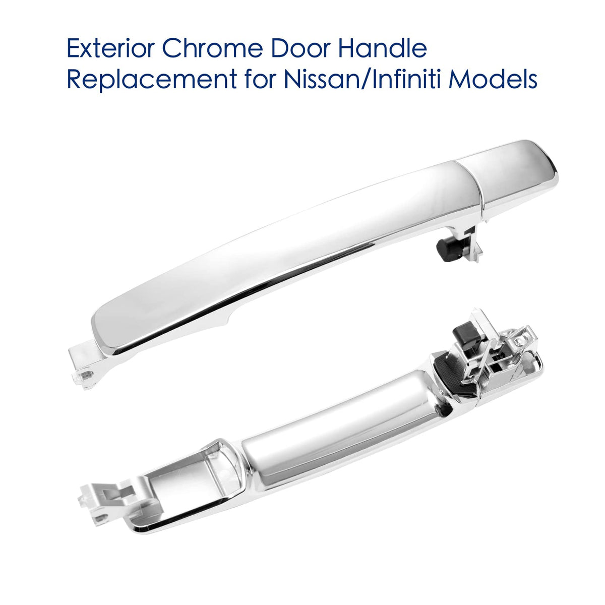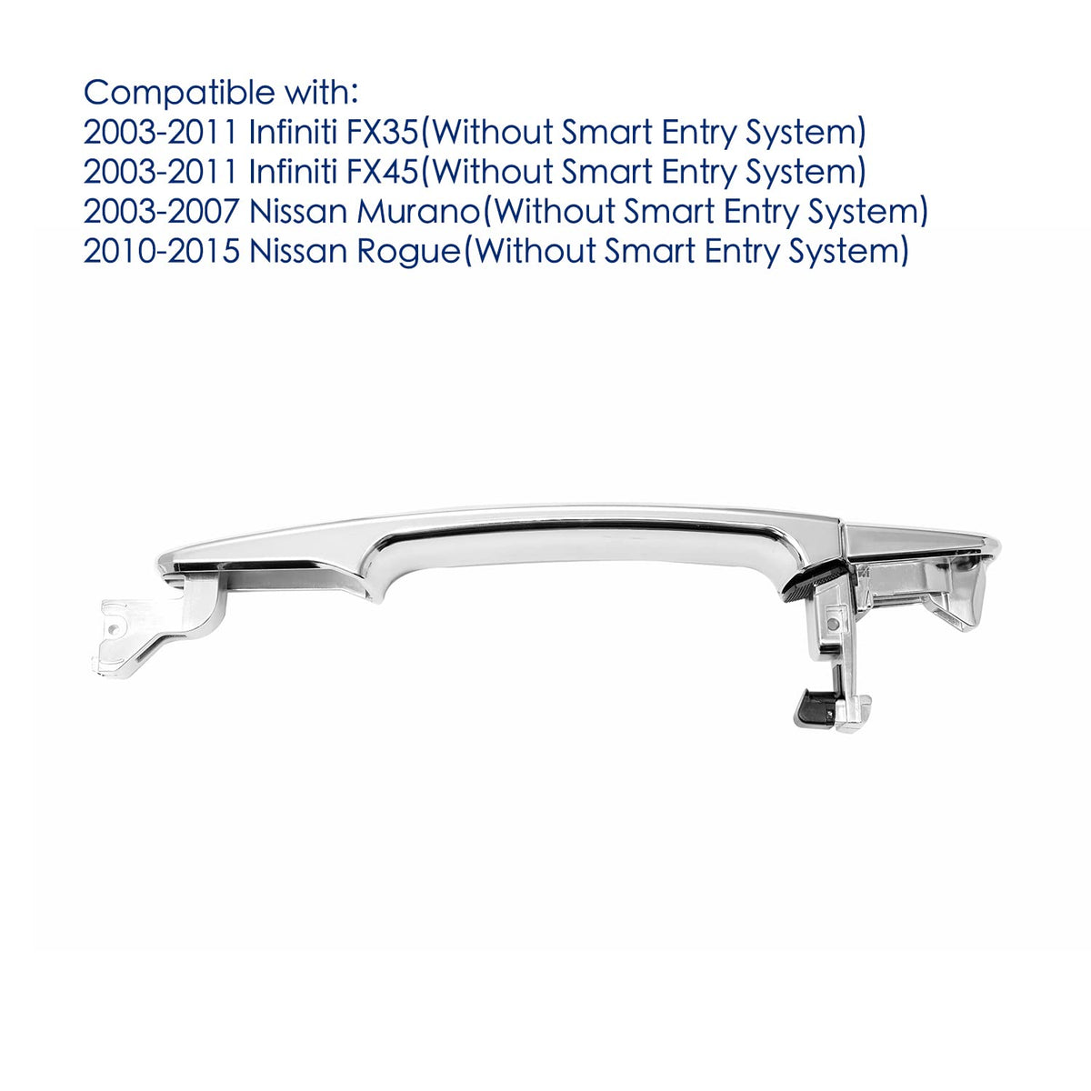 Replaces dealer part numbers:82646-CA000, 80640-CA012, 82646CA000, 80640CA012 Fits Vehicles Without Smart Passive Keys: for 2003-2011 Infiniti FX35 exterior door handle for 2003-2011 Infiniti FX45 exterior door handle for 2003-2007 Nissan Murano exterior door handle for 2010-2013 Nissan Rogue exterior door handle Package Includes: 1x Chrome Exterior Door Handle Location: Front Right, Rear Left or Rear Rightbr> Finish: Chrome 1.It is a OE replacement that is made with high quality material to provide the best performance and reliability. 2.This part looks and performs like original equipment -- they're all based on the same original equipment designs. 3.Lcyolada Door Handle is high-quality replacement parts designed to meet the Original Equipment parts' fitment, form, and function. 4.It is the vehicle direct replacement that is made from high quality materials to provide the best performance and reliability with strict quality control.