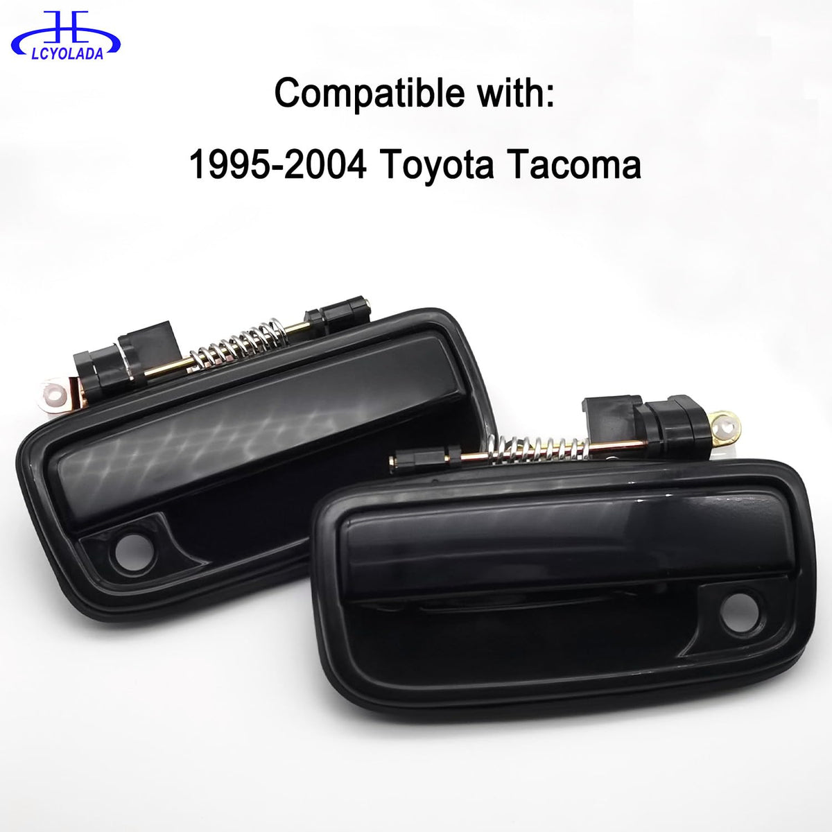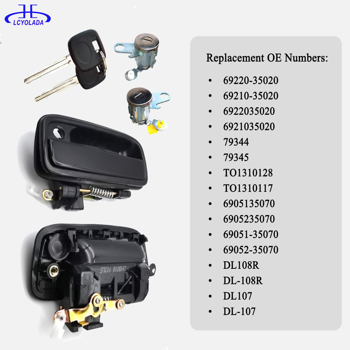 Pair of Exterior Door Handles w/Lock Cylinders & Keys Compatible with 1995-2004 Toyota Tacoma, Front Driver and Passenger Side with Key Hole Replaces 69220-35020, 69210-35020, 6905135070, 6905235070 Replaces dealer part numbers: 69220-35020, 69210-35020, 6922035020, 6921035020, 79344, 79345, TO1310128, TO1310117, 6905135070, 6905235070, 69051-35070, 69052-35070, DL108R, DL-108R, DL107, DL-107 Compatible with: 2004 Toyota Tacoma Base Crew Cab 2.4L L4 | 2.7L L4 | 3.4L V6 2004 Toyota Tacoma Base Extended Cab 2-Door 2.4L L4 | 2.7L L4 | 3.4L V6 2004 Toyota Tacoma Base Standard 2-Door 2.4L L4 | 2.7L L4 | 3.4L V6 1995-2003 Toyota Tacoma DLX Extended Cab 2-Door 2.4L L4 |2.7L L4 | 3.4L V6 1995 Toyota Tacoma DLX Standard Cab 2-Door 2.4L L4 | 2.7L L4 | 3.4L V6 2000 Toyota Tacoma Limited Extended Cab 2-Door 2.4L L4 | 2.7L L4 1998-2000 Toyota Tacoma Limited Extended Cab 2-Door 3.4L V6 2001-2003 Toyota Tacoma Pre Runner Crew Cab 4-Door 2.4L L4 2001-2004 Toyota Tacoma Pre Runner Crew Cab 4-Door 2.7L L4 | 3.4L V6 1998-2003 Toyota Tacoma Pre Runner Extended Cab 2-Door 2.4L L4 1998-2004 Toyota Tacoma Pre Runner Extended Cab 2-Door 2.7L L4 | 3.4L V6 1999-2003 Toyota Tacoma Pre Runner Standard Cab 2-Door 2.4L L4 1999-2004 Toyota Tacoma Pre Runner Standard Cab 2-Door 2.7L L4 | 3.4L V6 1998-2000 Toyota Tacoma SR5 Extended Cab 2-Door 2.4L L4 | 2.7L L4 1995-2000 Toyota Tacoma SR5 Extended Cab 2-Door 3.4L V6 2001-2004 Toyota Tacoma S-Runner Extended Cab 2-Door 3.4L V6 Color: Black Position: Fit for Front Left Drive and Right Passenger Side Package Includes: 1 x Front Left Exterior Door Handle 1 x Front Right Exterior Door Handle 2 x Lock Cylinders 2 x Keys ?Notice?: Please use Amazon Part Finder above to verify fitment.
