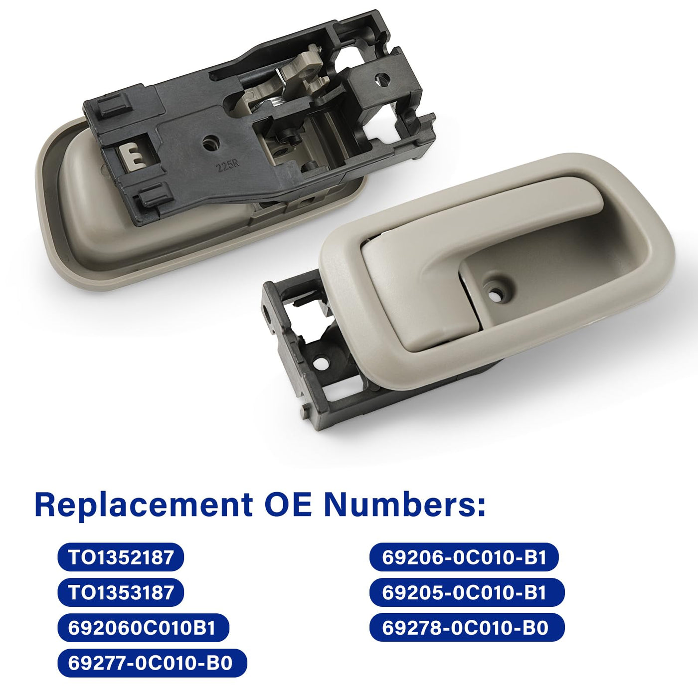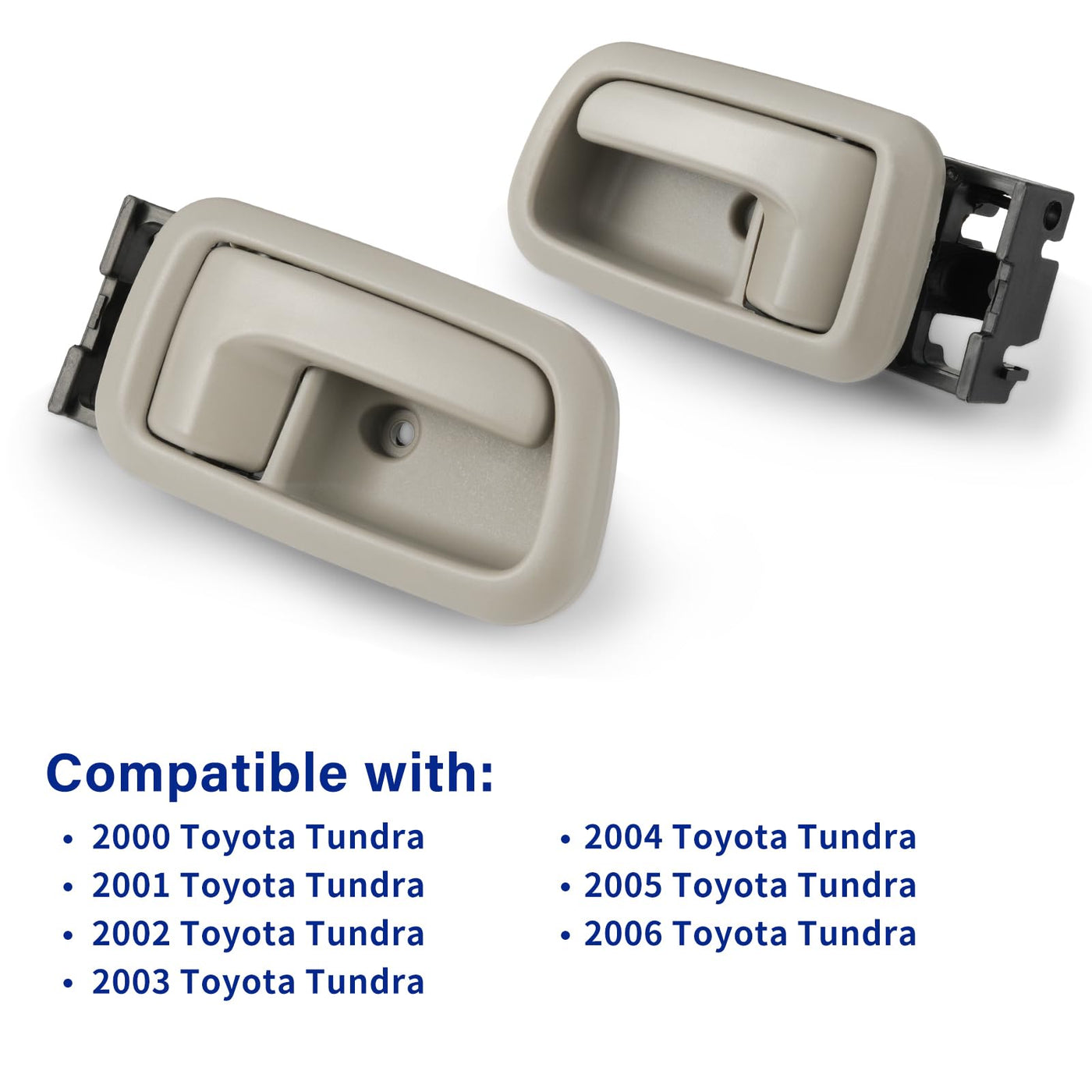 Pair Of Interior Door Handles Compatible With 2000 2001 2002 2003 2004 2005 2006 Toyota Tundra, Gray, Rear Left Driver & Right Passenger 69208-0C010-B1,69207-0C010-B1 Inside Handle Door Replaces Dealer Part Numbers:81291,69208-0C010-B1,81287,69207-0C010-B1 Location: Rear Left Drive & Right Passenger Side Compatible With: 2000 Toyota Tundra All Submodel 2001 Toyota Tundra All Submodel 2002 Toyota Tundra All Submodel 2003 Toyota Tundra All Submodel 2004 Toyota Tundra Base Standard Cab Pickup-2 Door 2004 Toyota Tundra Limited Extended Cab Pickup 2004 Toyota Tundra Sr5 Extended Cab Pickup-4 Door 2004 Toyota Tundra Sr5 Standard Cab Pickup 2005 Toyota Tundra Base Standard Cab Pickup-2 Door 2005 Toyota Tundra Limited Extended Cab Pickup-4 Door 2005 Toyota Tundra Sr5 Extended Cab Pickup-4 Door 2006 Toyota Tundra Base Standard Cab Pickup-2 Door 2006 Toyota Tundra Limited Extended Cab Pickup-4 Door 2006 Toyota Tundra Sr5 Extended Cab Pickup-4 Doorpackage Includes: 1 X Gray Rear Left Driver Side Interior Door Handle With Bezel 1 X Gray Rear Right Passenger Side Interior Door Handle With Bezel