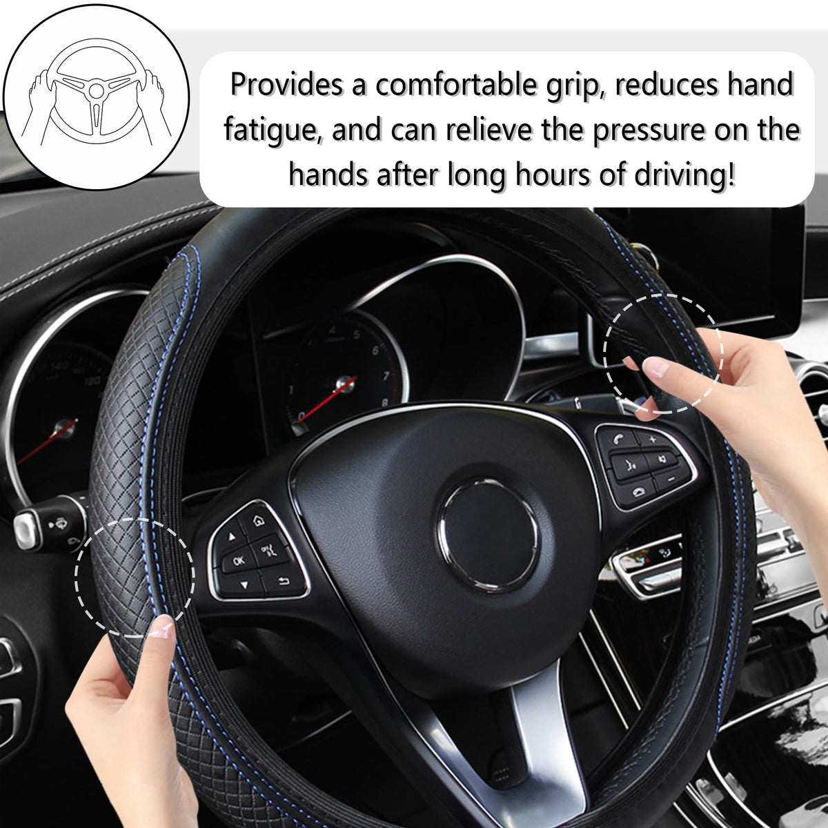 Q: Does the cover provide good grip and control while driving?A: Yes, the Leather Steering Wheel Cover is designed with an anti-slip feature that enhances grip and control, reducing hand fatigue during long drives.