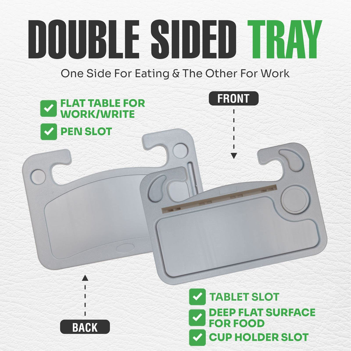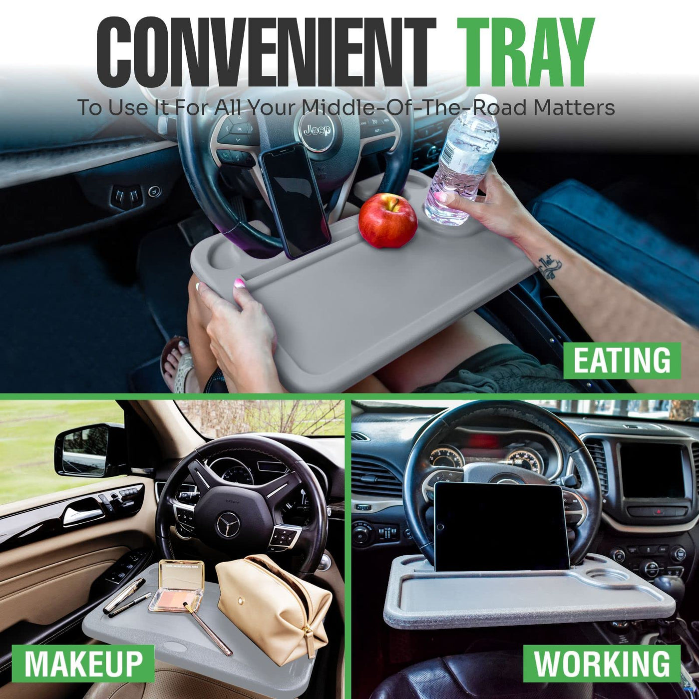 ? Easy and Convenient - This multipurpose Hook-On Steering Wheel Tray is the perfect accessory to have in your car for a quick snack, breakfast, or to create a small office while traveling. The Car Tray is slim, lightweight, and takes up almost no space when not needed. Just store it in the back seat pocket. Easy and convenient to use. | ? Sturdy and Durable - Our Car Steering Wheel Table is robust enough to support a tablet, notebook, and even a laptop or a full lunch with drinks. The tray measures 16.5