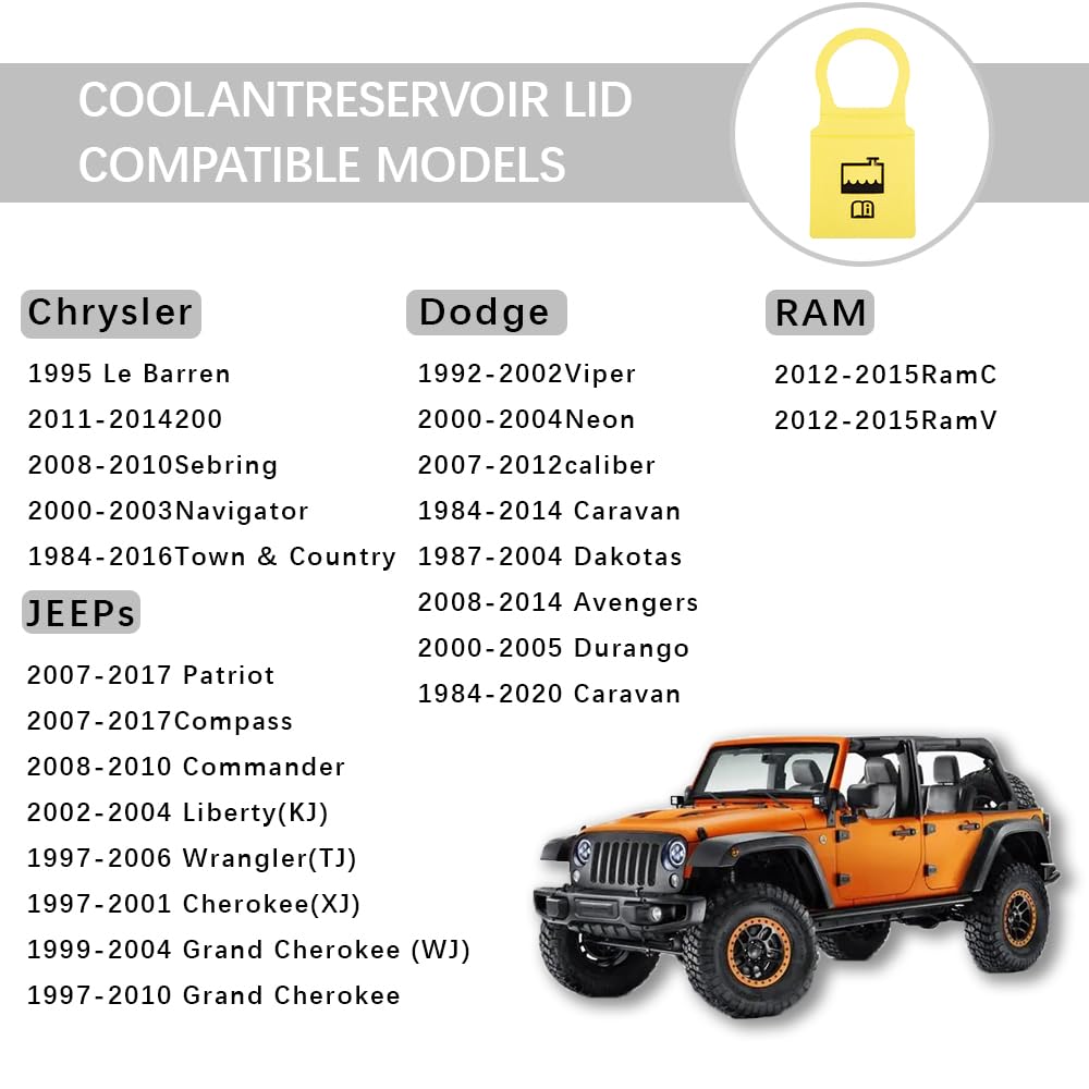 Q: What vehicles are compatible with the Lecctso Engine Coolant Reservoir Cap?A: The Lecctso Engine Coolant Reservoir Cap is compatible with various Chrysler models, including Sebring (2008-2010), LeBaron (1995), Town & Country (1984-2016), and Voyager (2000-2003). It also fits several Dodge models such as Avenger (2008-2014), Caliber (2007-2012), and Grand Caravan (1984-2020), along with Jeep models like Wrangler (1997-2006) and Grand Cherokee (1999-2004).
