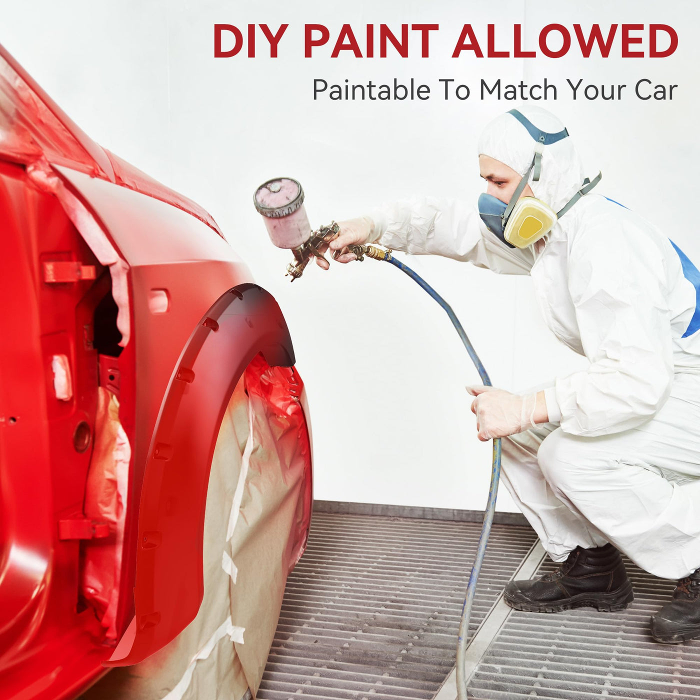 Q: Can I paint these fender flares to match my vehicle's color?A: Yes, the fender flares have a smooth black finish and can be painted to match the specific color of your vehicle if desired.