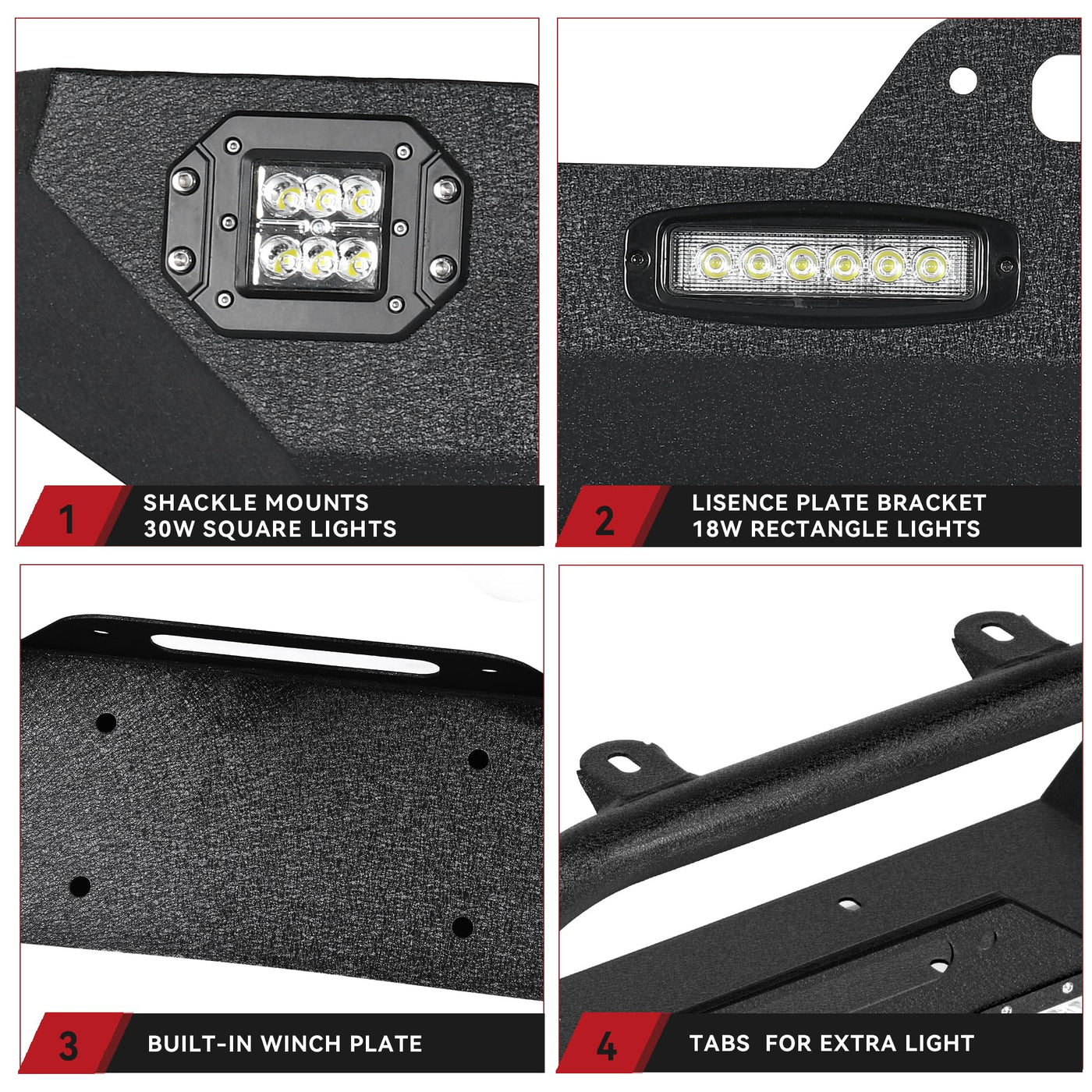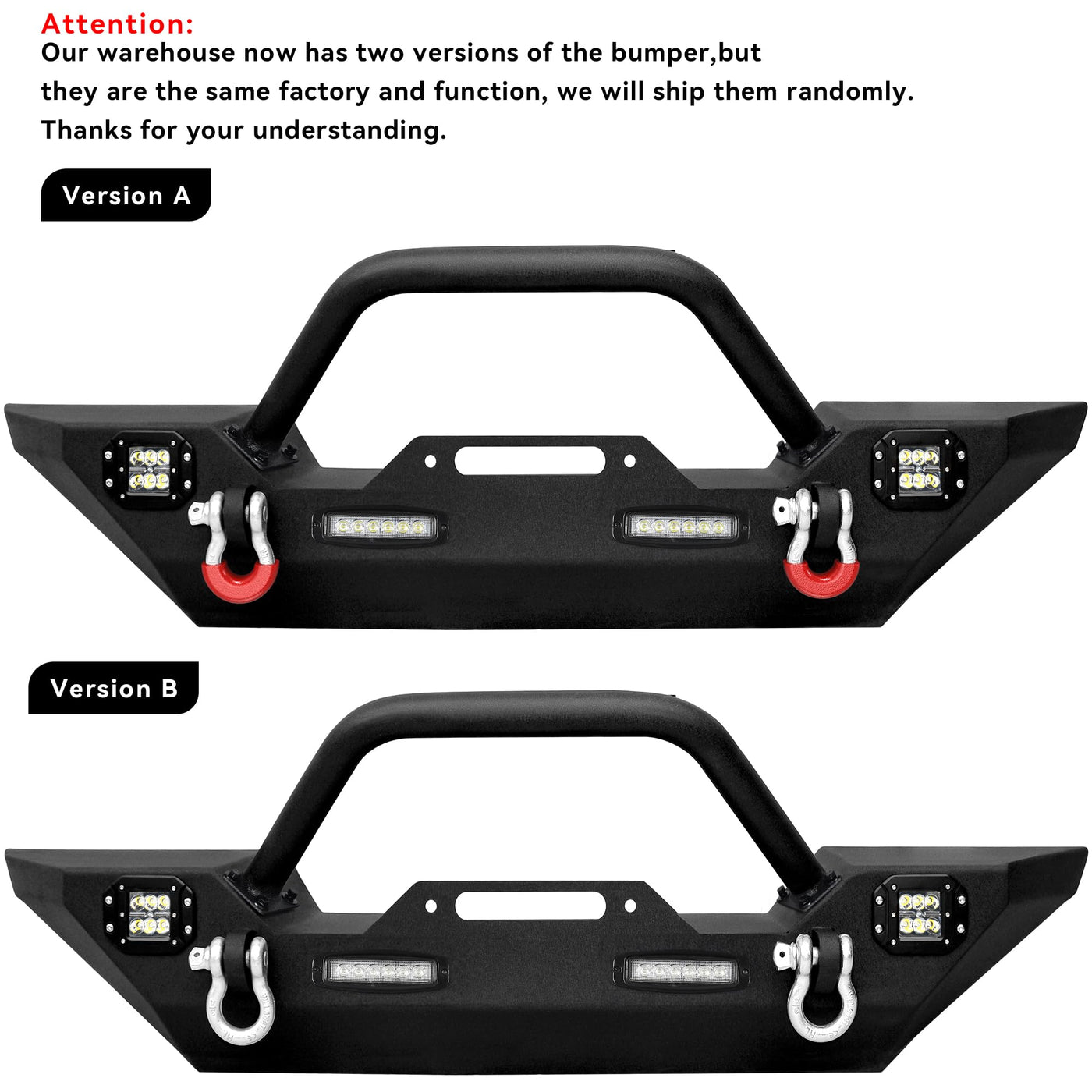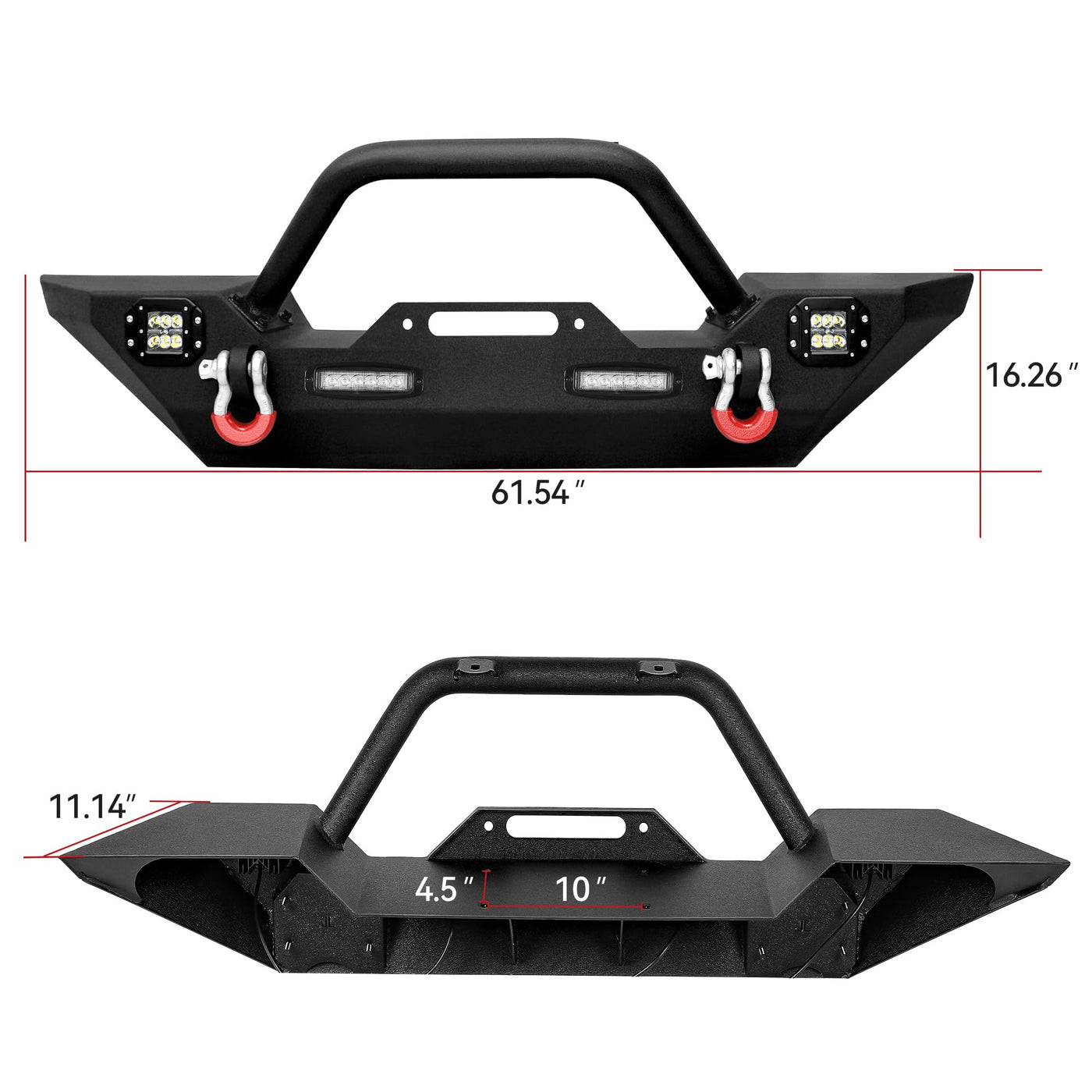fitmentthis rock crawler bumper compatible with 2007-2018 jeep wrangler jk and jk unlimited 2/4 doors models. | ''heavy duty construction our front bumper is manufactured from durable 5/32'' steel sheet and 2''x0.120'' steel tubing for superior strength and durability.two-stage textured black powder coating finish for long lasting corrosion resistance.'' | led accent lightingbuilt-in 2x18w and 2x20w led lighting for impressive styling. ledkingdomus front bumper offers you a wider field of vision in the night. please note: you may need to get a set of wiring harness as it is not included in the package. | shackle mount and d-ringstwo solid d-ring shackle mounts which rated up to 9000 lb for increasing strength. built-in winch plate for up to 12,000 lbs (winch not included), enhances the looks and provide points for vehicle recovery. | easy installation packaged with all mounting hardware and installation instruction. bolts-on installation, no drilling required.