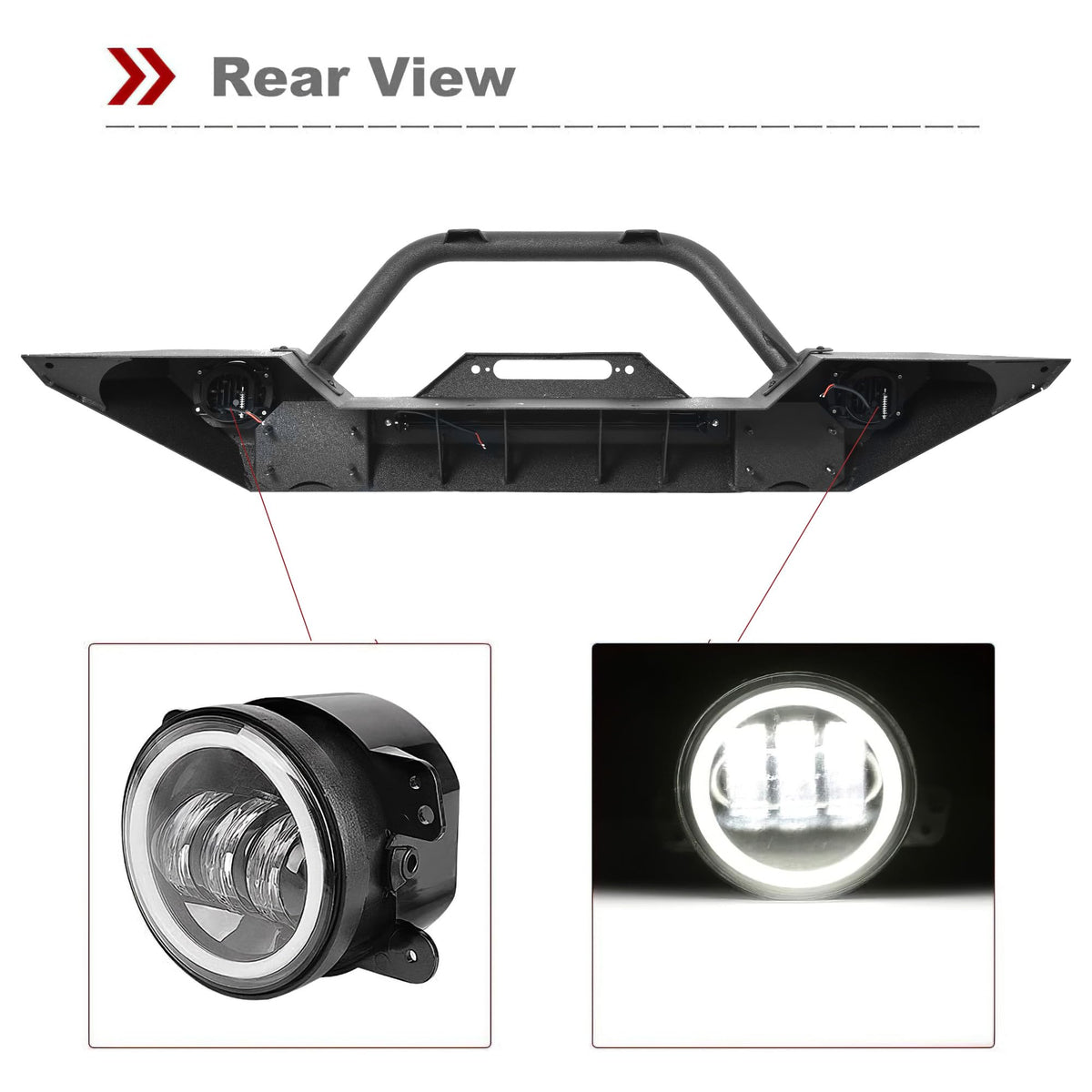 ?Fitment?Suitable for 2007-2018 Jeep Wrangler JK and JK Unlimited models, including 2-door and 4-door models. | ?Accent Lights with Harness?The HD Bumper with built-in 90W LED Light Bar between D-ring mounts and round 2 X60W Fog Lights offer a stylish look. Also includes a 3-lead wiring harness for installation. These accent Lightings not only look good, they also achieve better illumination and vehicle visibility for additional safety when parked on dark roads. | ?Heavy Duty Construction and Simple Installation?The front bumpers are compatible with jeep wrangler and manufactured with durable 5/32'' steel sheet and 2''X0.120'' steel tubing. Designed for a direct bolt-on installation with only basic hand tools required. | ?Shackle Mount and D-rings?Two solid D-ring shackle mounts are welded onto the front bumper for additional strength. Built-in winch plate has weight capacity of up to 12,000 lbs (winch not included). Offers a great place to mount a winch and efficient vehicle recovery. | ?Corrosion Resistant Finish?E-coat and premium textured-black powder coating grant long-lasting corrosion resistance.