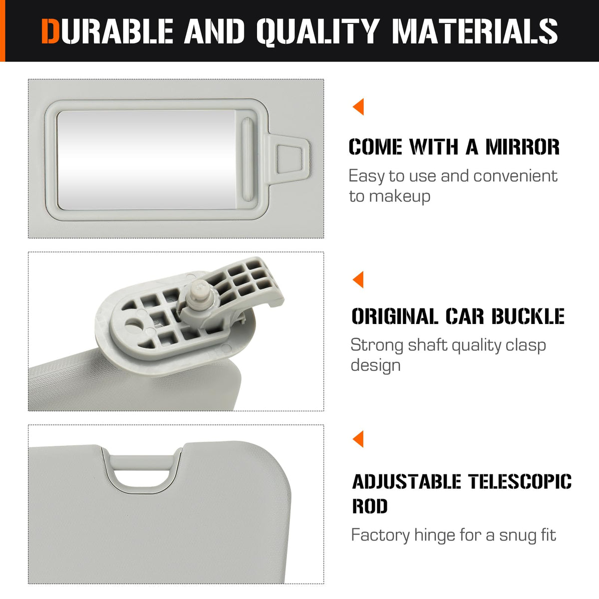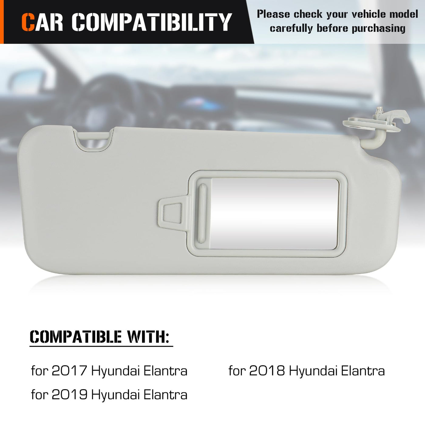 Color: Grey Compatible with: for 2017-2019 Hyundai Elantra Dimension: 16.93 x 8.39 x 2.76 inch, weighs 2.6 BL Replace for part number: 85210-F0100TTX 85210F0100TTX 85220-F0100TTX 85220F0100TTX Package: 1x Left Driver & Right Passenger side sun visor