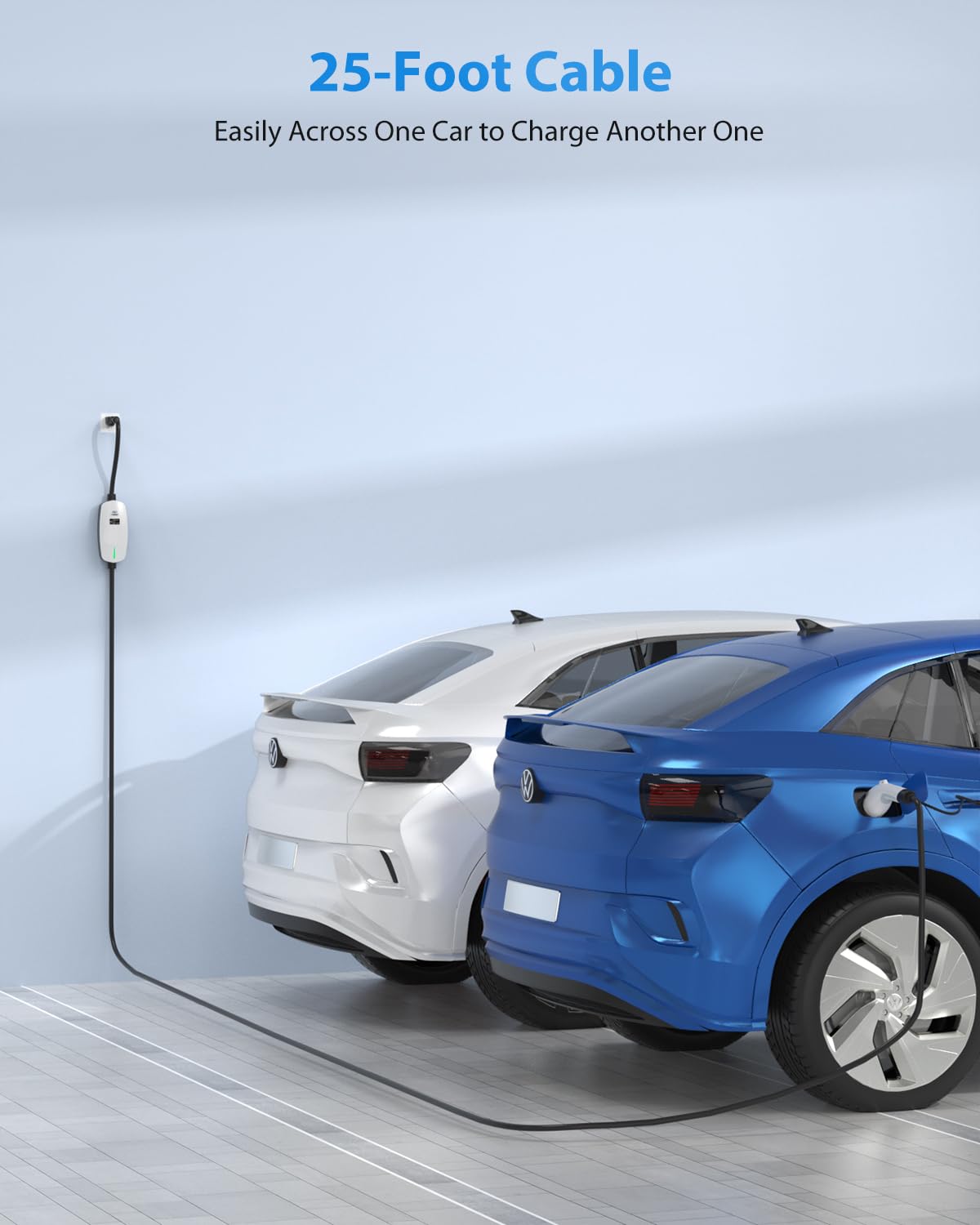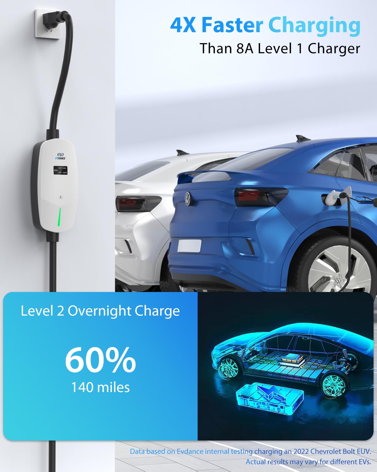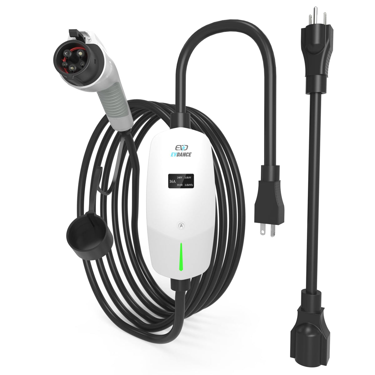FAST CHARGING - Utilizing the standard J1772 charging protocol, this charging cable is compatible with all electric cars and plug-in hybrids. The Level 1 portable electric vehicle charger has a 21ft cable thats long enough for most driveways or garages ?Superior Performance?EVDANCE 16Amp Level 1 & Level 2 EV charger is compatible with J1772 electric vehicles and plug-in hybrid vehicles (North American Standard), it is 4x faster than other 8A L1 EV chargers. *Tesla requires a SAE J1772 adapter. ?Indication Displays?LED display that can tell you the status as well as indicate errors while charging your electric vehicle. ?Durable and Safe?This electric car charger is made of high-grade rugged materials, FCC and CE certified.The intelligent chip design of its control box can keep monitoring the charging status at any time, and the protection level of the housing is IP66 and the fire rating is UL94V-0. ?Convenient to Use?This portable charger has both NEMA 6-20 (220V or 240V) and NEMA 5-15 (110V) plugs for you to use, and the included bag makes it easier to carry on the go. It also has a 25ft cable length, you can use it flexibly from anywhere in the garage or driveway. ?Contact Us Anytime?This electric vehicle charger has a one-year warranty, if you feel that the product does not meet your expectations, please feel free to contact us and we will solve the problem.