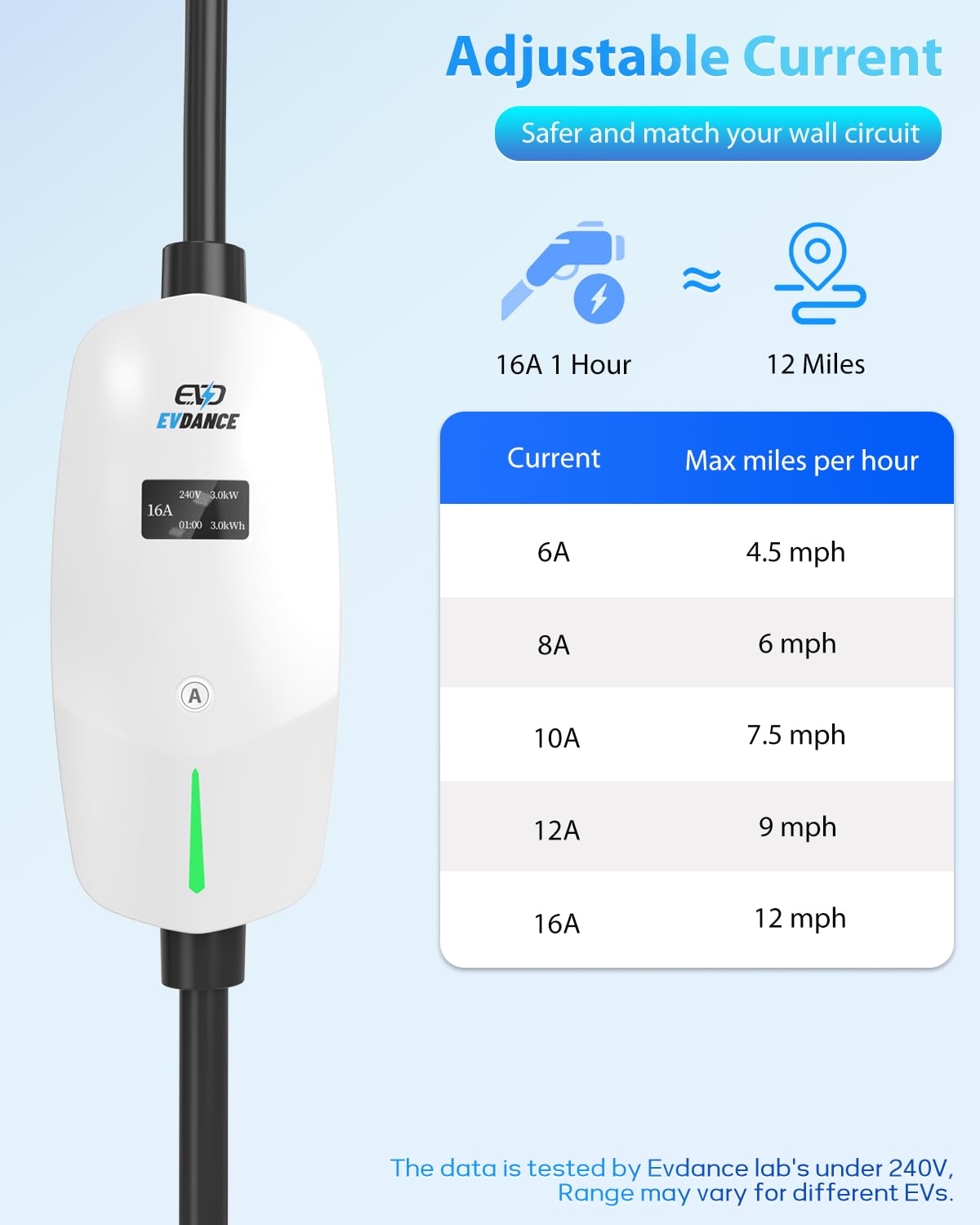 Level 1 Ev Charger 110V/240V - Evdance Portable Electric Car Charger 6-16A Adjustable, J1772 Charger With 25 Ft Charging Cable,