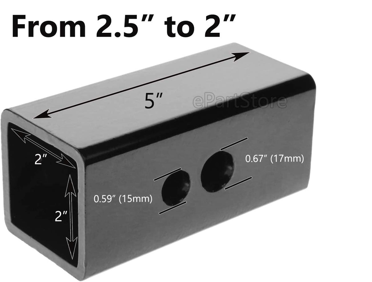 Q: What is the purpose of the LFPartS 2.5 to 2 inch trailer hitch adapter?A: The LFPartS 2.5 to 2 inch trailer hitch adapter reduces a 2.5" receiver to a 2" receiver, allowing for greater compatibility with various towing applications.