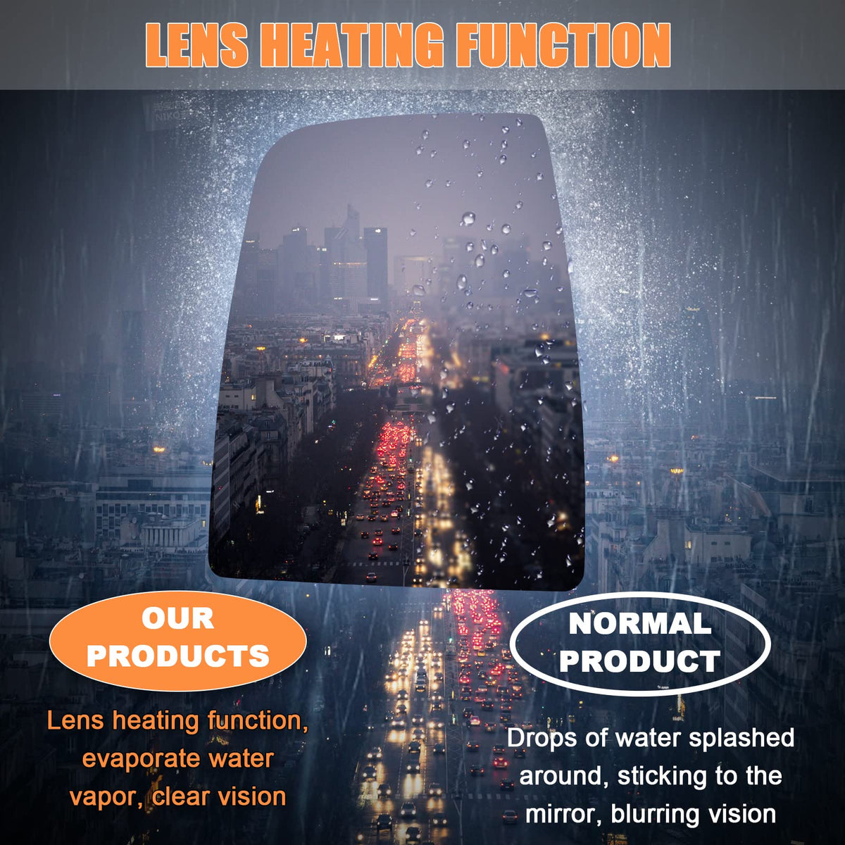 Q: Does this mirror glass have any special features?A: Yes, this mirror glass includes a heated function to prevent fogging and ice buildup, enhancing visibility in various weather conditions. It does not come with auto-dimming features.