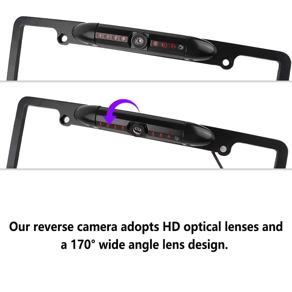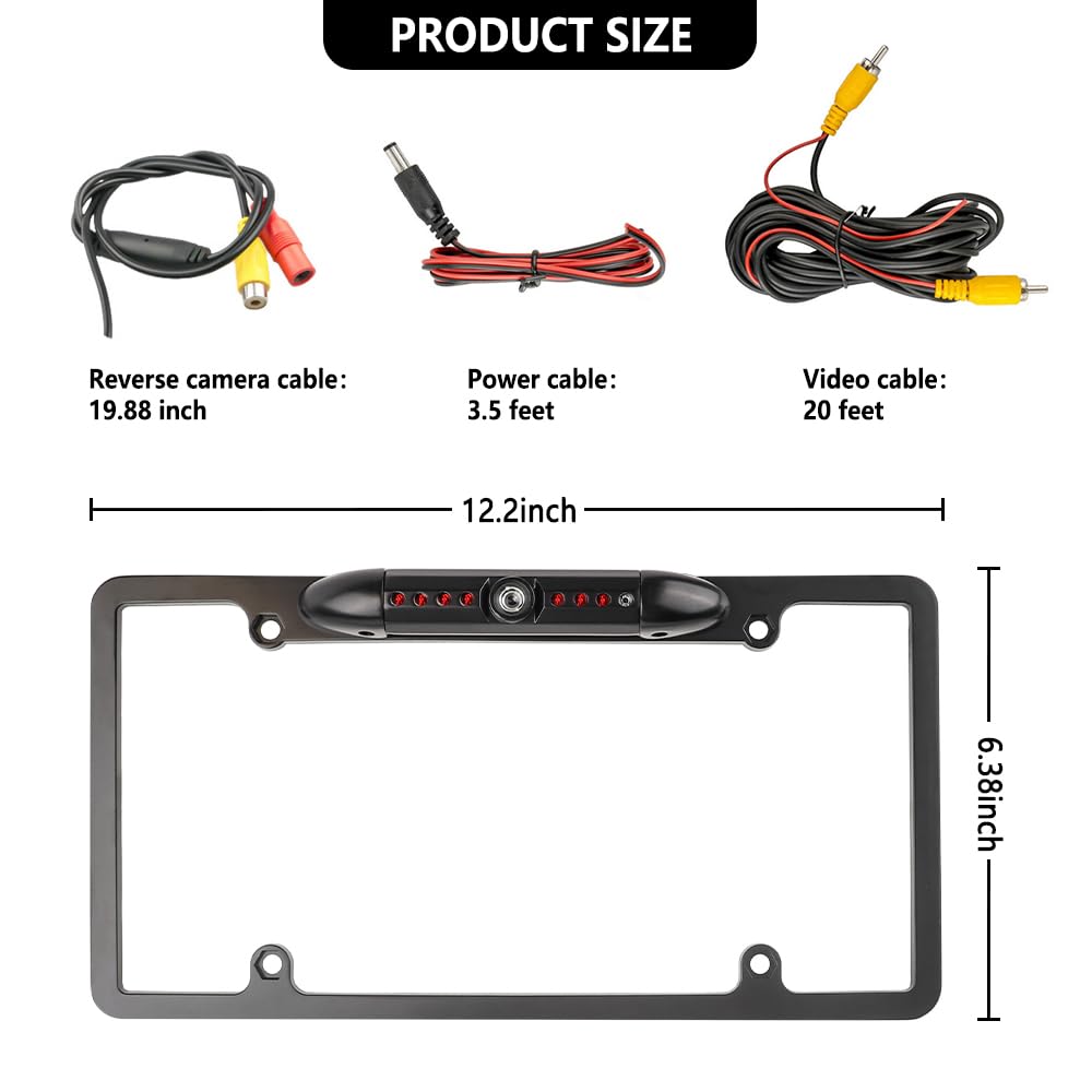 Safe Reversing, You Need A Clear Pair Of Eyes!???Pre Purchase Instructions?? The License Plate Backup Camera Is Only Suitable For Us License Plates.? Before Purchasing, Please Carefully Confirm The Size Of The License Plate To Ensure Perfect Compatibility.???License Plate Camera Parameter?? Video Format:Ntsc? Resolution:648*488 Pixels? Lens Angle:170? Waterproof Grade:Ip69? Seismic Grade:Ip69? Power Supply:Dc12V-24V? Night Vision Distance:26.25-32.8 Feet???License Plate Camera Dimensions?? Reverse Camera:12.2X6.38 Inch? Reverse Camera Cable:19.88 Inch? Rca Video Cable:20 Feet? Power Cable:3.5 Feet???License Plate Camera Attributes?? Colors:Black? Weight:22.65 Oz? Material:Heavy Metal? Packaging:1X License Plate Camera, 1X Rca Video Cable (20 Feet), 1X Power Cable (3.5 Feet)&Nbsp;???License Plate Camera Functions?? Feature:Hd Night Vision, 170Wide Angle, Waterproof, Shockproof? Function:Assist In Safe Reverse And Avoid Blind Spots