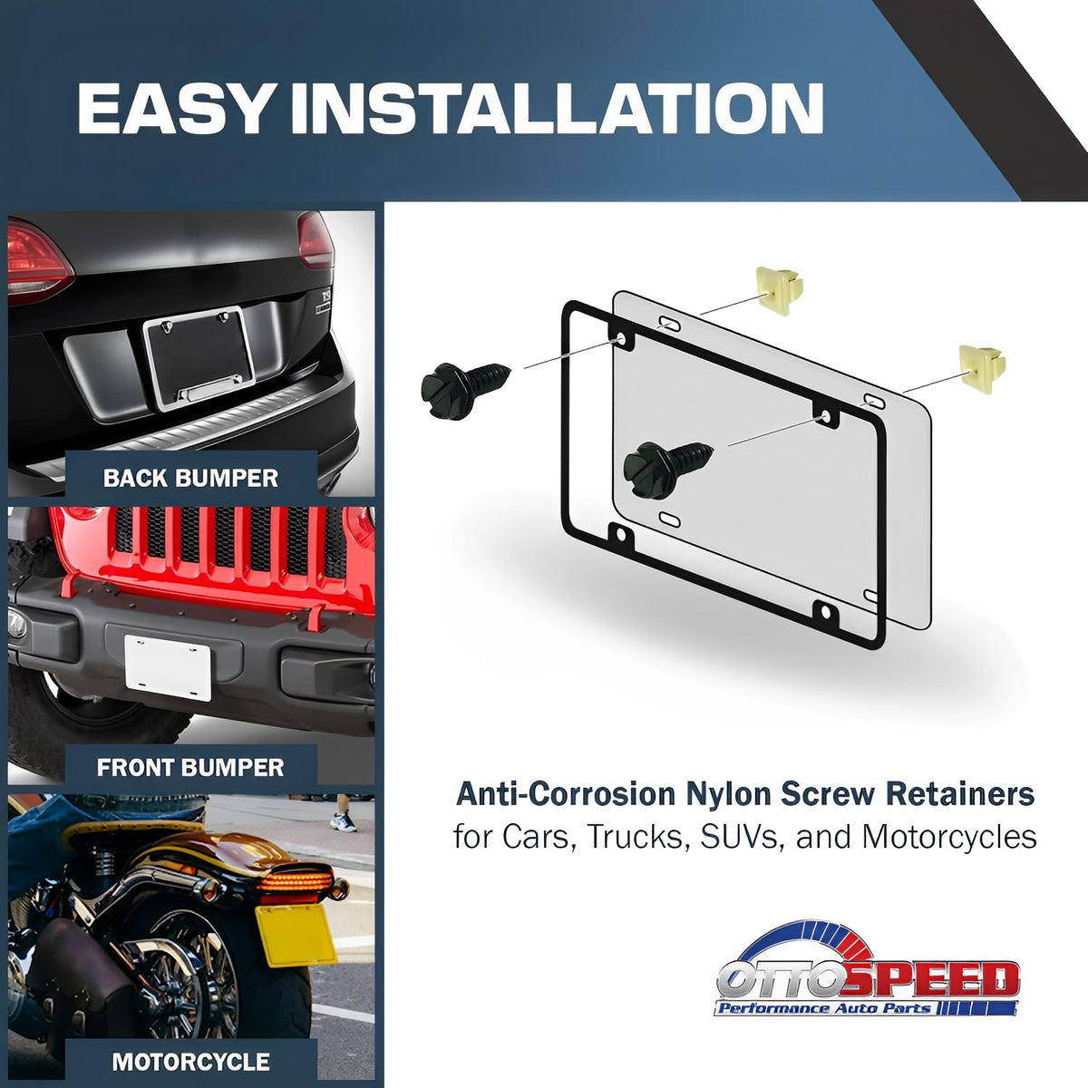 OttoSpeed: Set of 8 License Plate Screw Insert Retainers for Mounting License Plates (Nylon)Our motto is: ''Buy it once, buy it to last''. It doesn't matter what the part is, when it's on your car it needs to be built to survive the toughest conditions. We use high-quality nylon material to ensure that these license plate screw inserts are resistant to corrosion and are rustproof. Our license plate bracket clip retainers will survive the salty air of the ocean side and salty roads during winter weather, and extreme hot and cold temperatures.Easy to InstallThis set of nylon retaining nuts is easy to use and install. These license plate screw retainers work on most domestic cars, trucks, vans, SUVs, RVs, and motorcycles including Chevy, Chrysler, Dodge, Jeep, Ford, and General Motors brands Cadillac, Buick, and Chevrolet. They work with vehicles they use self-tapping license plate screws.OttoSpeedWe manufacturer hardware and automotive accessories that are designed to last longer and do more. We're car experts who love what we do. If for any reason you think these are not the correct license plate screw retainer nuts for your needs, just contact us and we'll make it right. No questions, no hassle, no fuss.