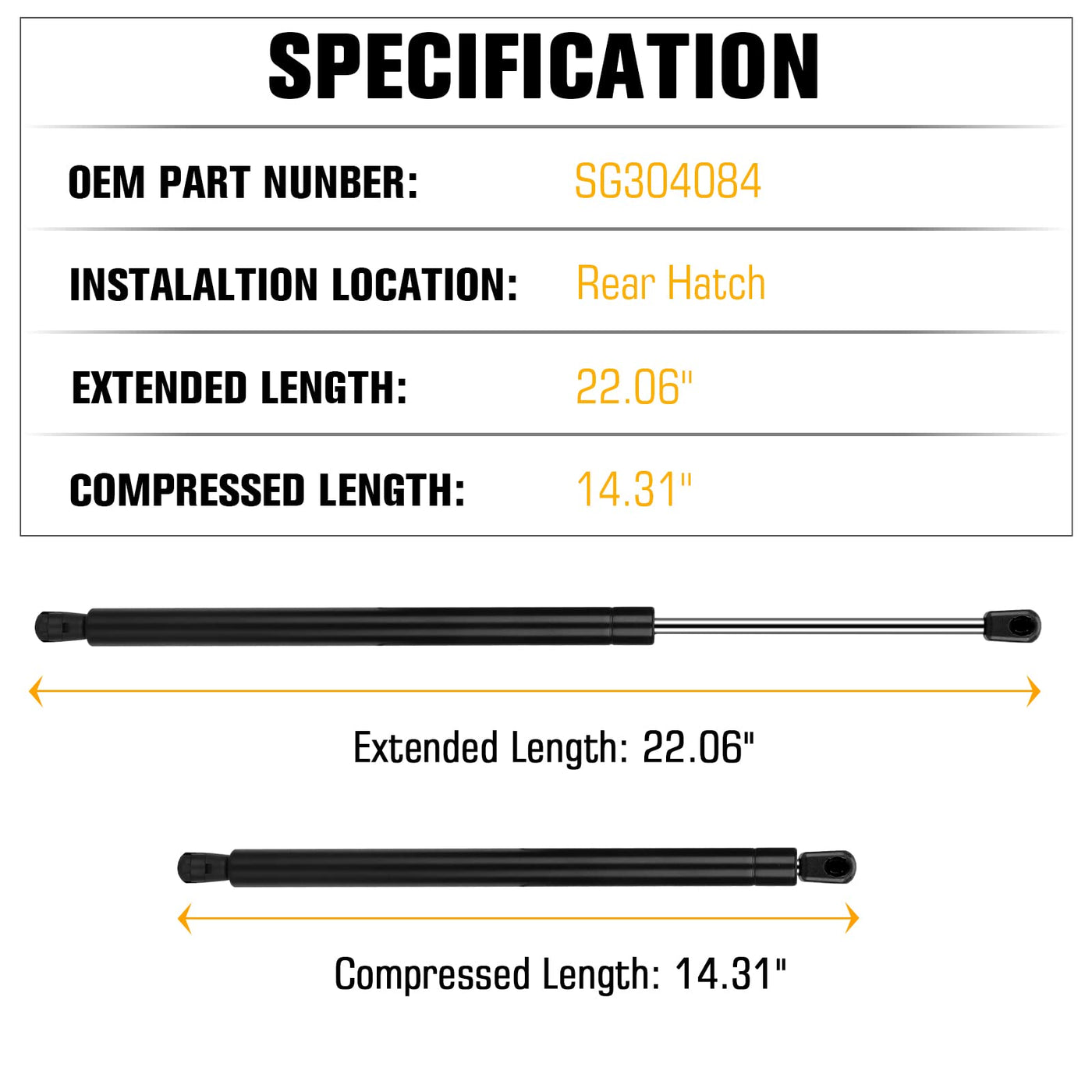 Q: What are the specifications of the Liftgate Rear Hatch Lift Support?A: The lift support features an extended length of 22.06 inches and a compressed length of 14.31 inches, ensuring a perfect fit and optimal function for your vehicle's liftgate.