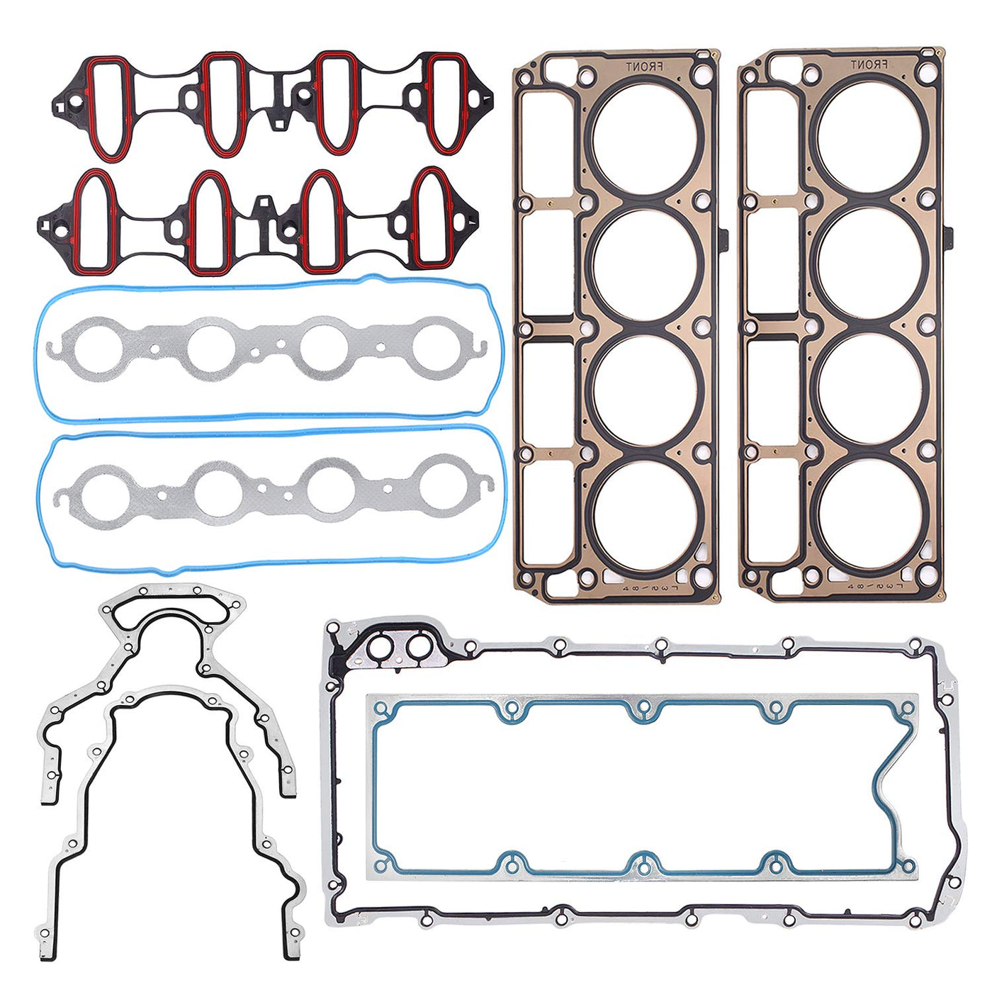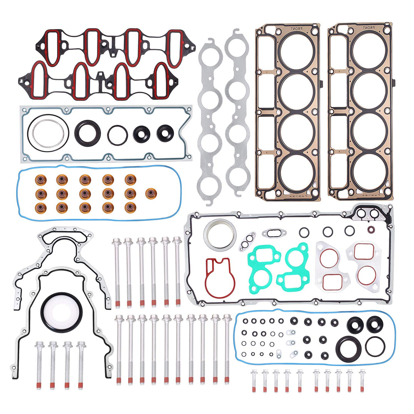 Q: What does the LIMICAR Cylinder Head Gasket Full Set include?A: This complete head gasket set includes multi-layered steel (MLS) head gaskets, intake manifold gaskets, exhaust manifold gaskets, valve cover gaskets, Viton valve stem seals, O-rings, other small gaskets and seals, a timing cover gasket, an engine oil pan gasket set, and 30 head bolts.