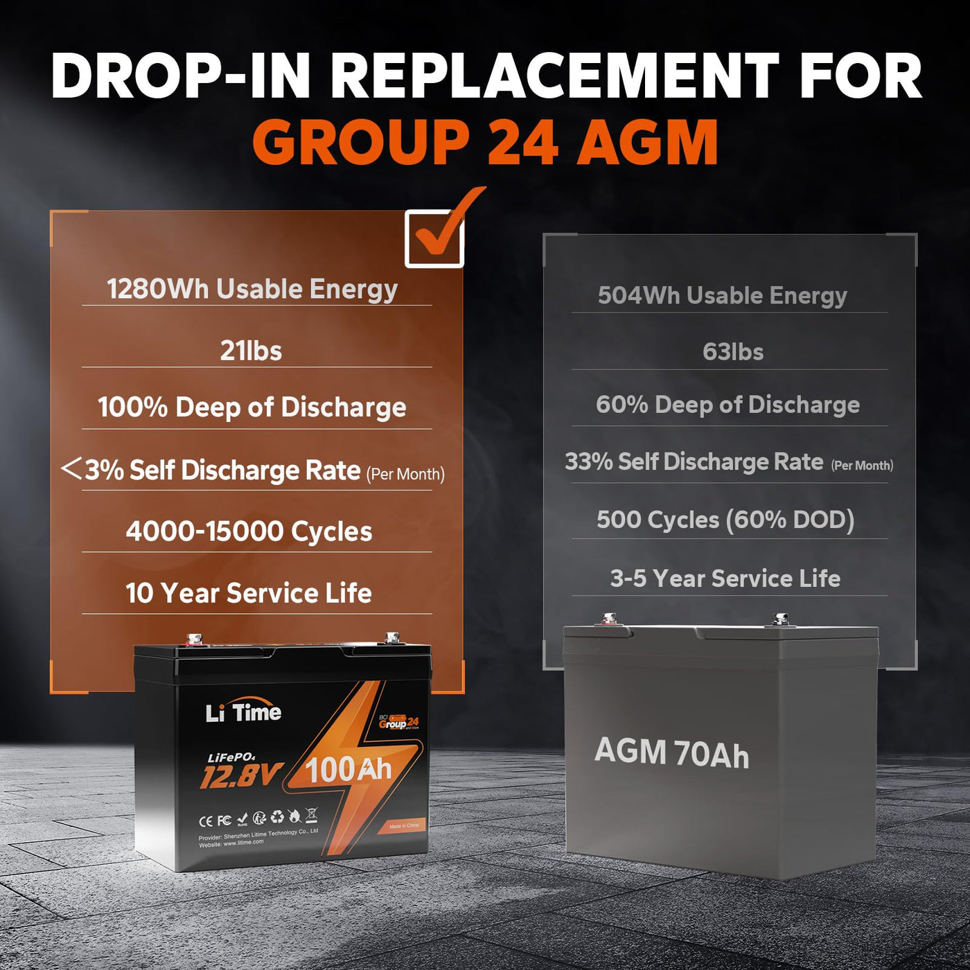 Litime 12V 100Ah Bci Group 24 Lifepo4 Battery, 100A Bms Rechargeable Lithium Battery With Up To 15000 Cycles, 1.28Kwh -Higher Energy Density, Perfect For Rvs, Van, Trailer, Motorhome And Boats