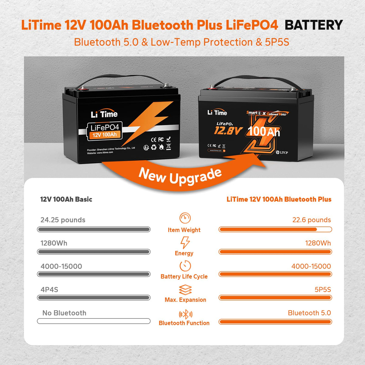LiTime 12V 100Ah OBM Bluetooth LiFePO4 Battery with Low Temp Protection, Group 31 Lithium Battery, Buit in 100A BMS, Up to 15000 Deep Cycles, Perfect for Trolling Motors,Yacht, Marine, Boat, RVs,Vans, Motorhomes, Home Energy, Solar Power Storage, Off-Grid Solar Power System, Backup Power, ect