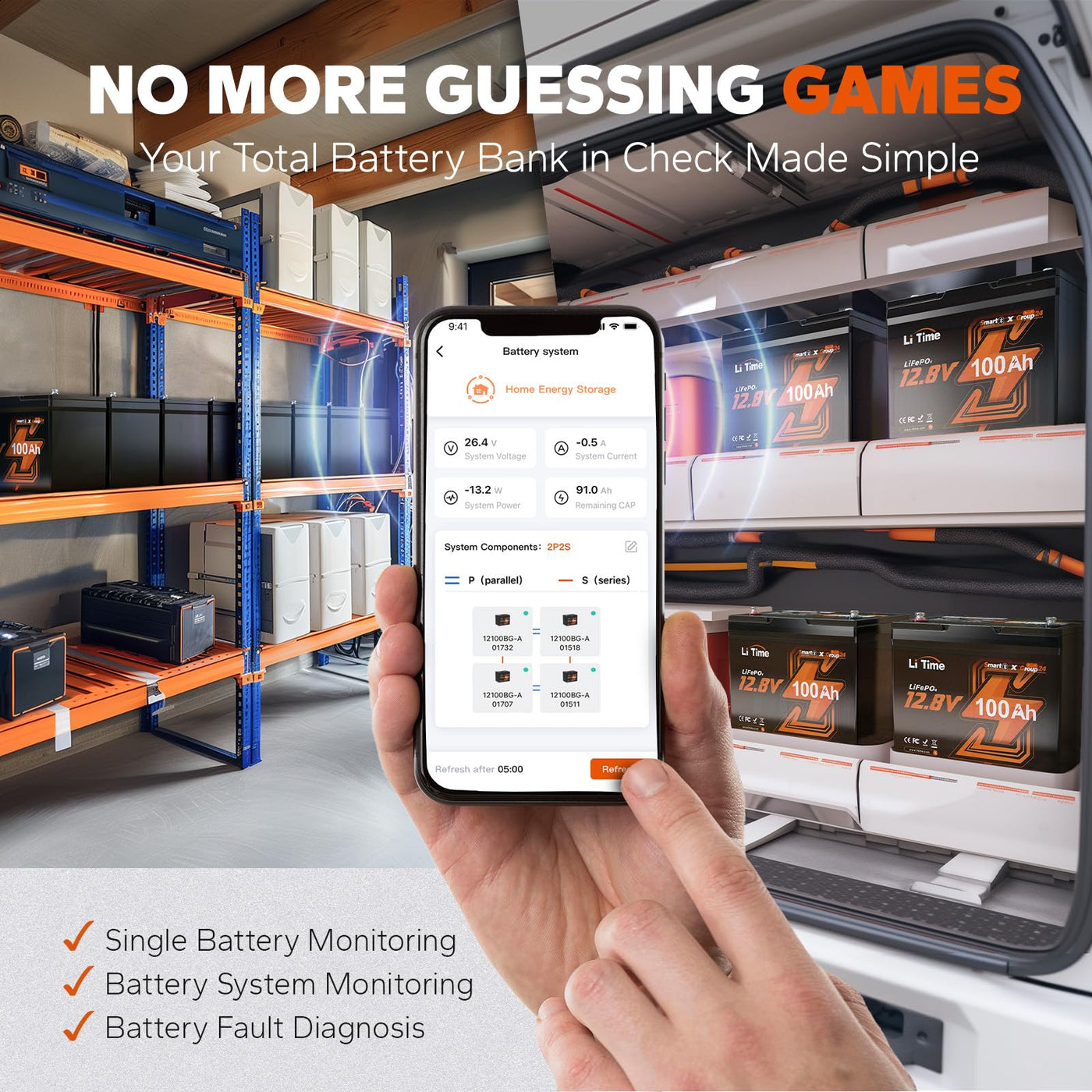 Q: What are the main advantages of using the LiTime 12V 100Ah Bluetooth LiFePO4 battery over traditional lead-acid batteries?A: The LiTime 12V 100Ah Bluetooth LiFePO4 battery offers several advantages over traditional lead-acid batteries, including a significantly lighter weight (only 21.9 lbs), a longer lifespan of up to 15,000 cycles, higher energy density (3-5 times greater), and built-in Bluetooth monitoring for real-time battery status via the LiTime app.