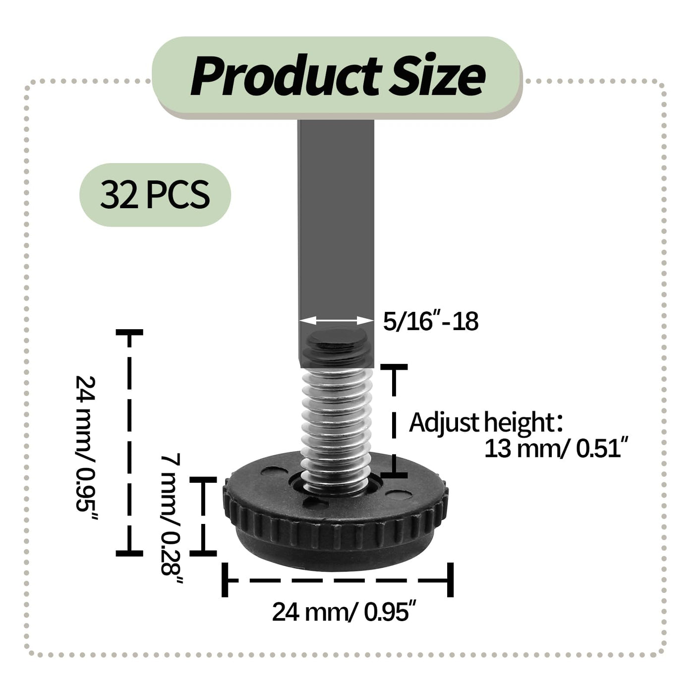 Specifications Product Name: Furniture Leveling Feet Material: Stainless Steel, Nylon Thread: 5/16'-18 Shaft Length: 0.67 inch/17mm Base Dia:1 inch/25mm Base Height: 1/4 inch Color: Black, Silver