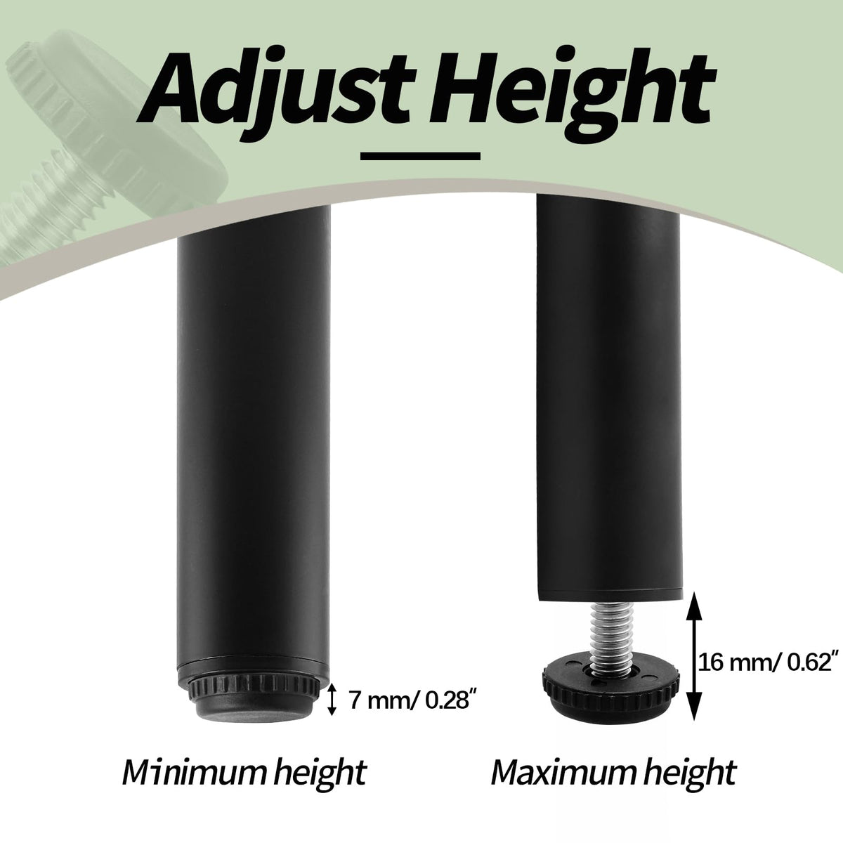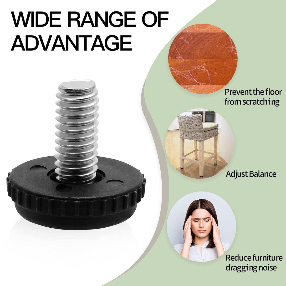Q: How do these leveling feet improve furniture stability?A: The threaded screw-in design of the Litoexpe leveling feet enhances furniture stability by preventing wobbling, reducing friction, and minimizing noise when moving furniture.