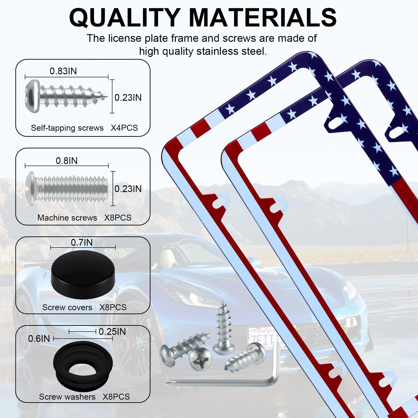 Livtee American Flag License Plate Frames, 4 Holes Stainless Steel License Plate Covers, 2Pcs License Plate Holder, Automotive E