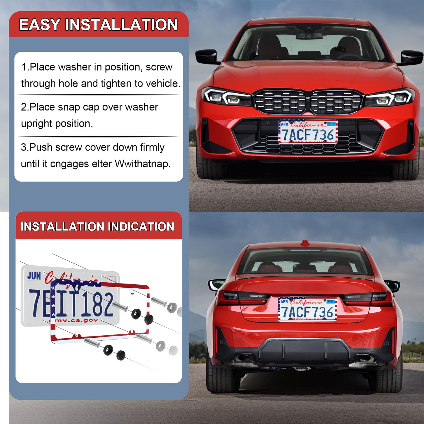 Q: What accessories come with the license plate frames?A: The LivTee license plate frames come with a complete installation kit, which includes 2 license plate frames, 8 plastic screw caps, 8 plastic washers, 8 machine screws, 4 self-tapping screws, and a screwdriver for easy setup.