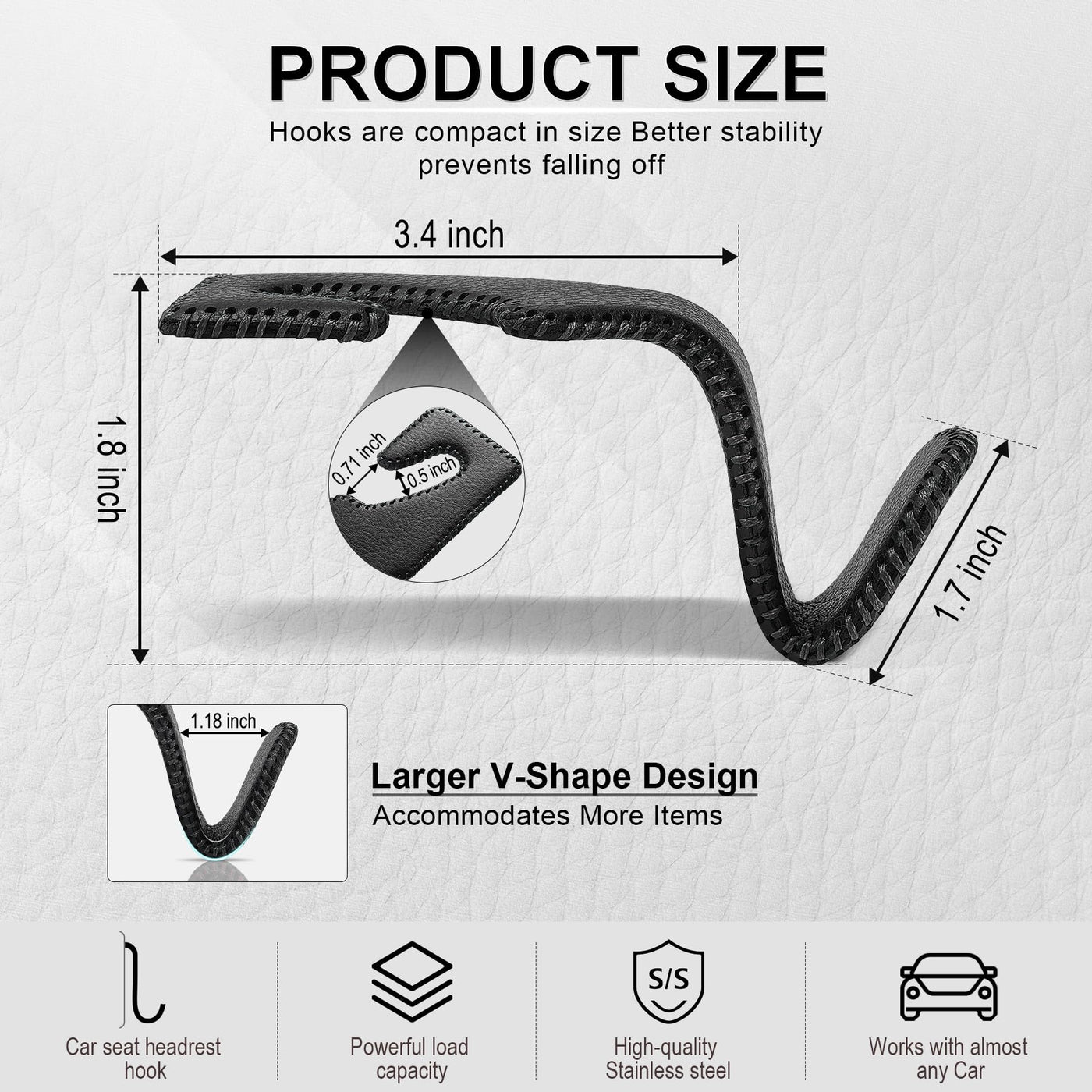 Q: What are the dimensions of the LivTee car seat hooks?A: The LivTee Black Superior Leather Car Seat Back Headrest Hooks do not have specified dimensions as they are designed to fit most vehicle headrests. They are versatile and accommodate various bag sizes.
