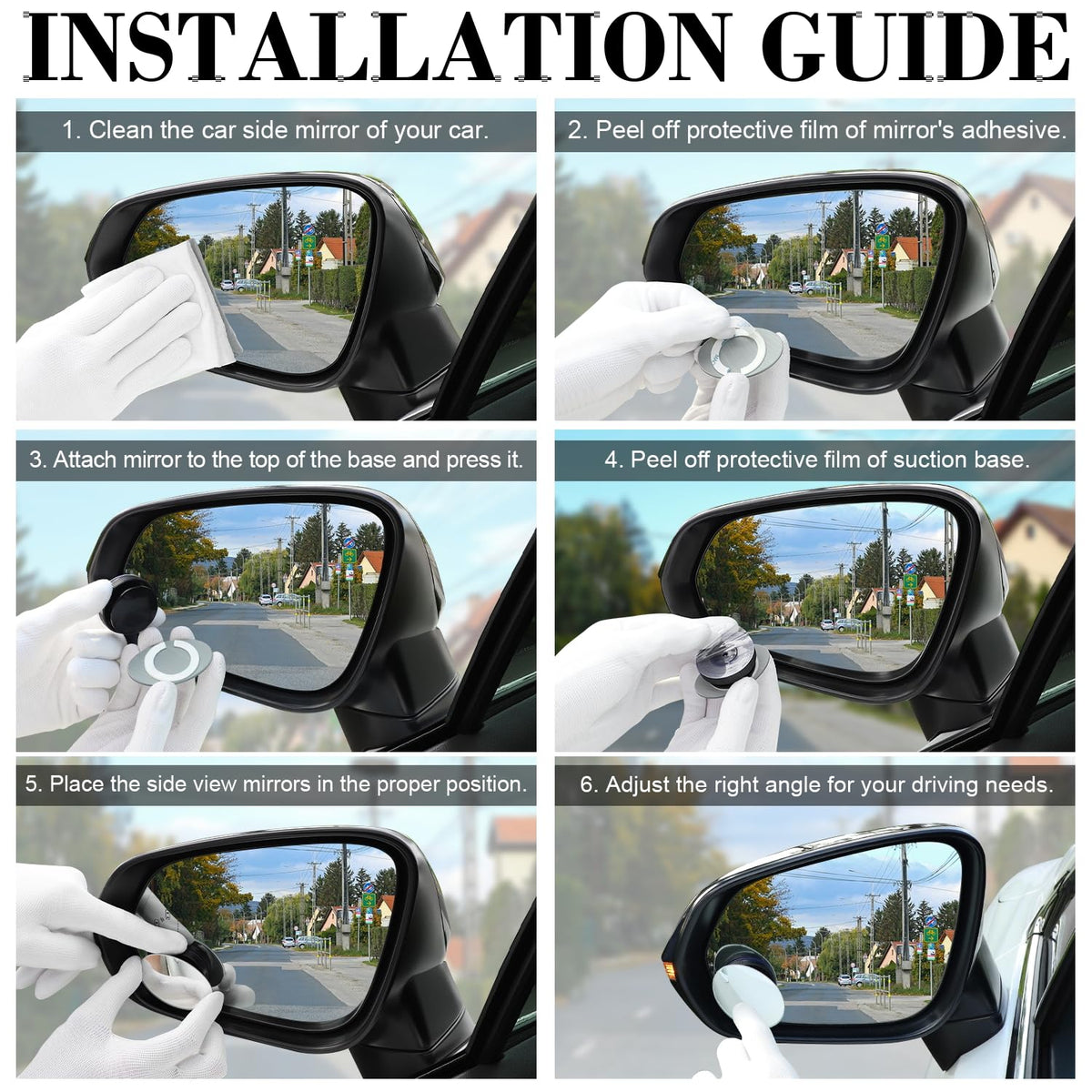 Q: How do I install the LivTee Blind Spot Car Mirror?A: To install the LivTee Blind Spot Car Mirror, first clean the side mirror of your car thoroughly. Next, peel off the protective film from the suction base and place the side view mirror in the desired position. Twist the mirror clockwise to tighten it. Finally, peel off the protective film from the mirror's adhesive and attach it to the top of the base to complete the assembly.