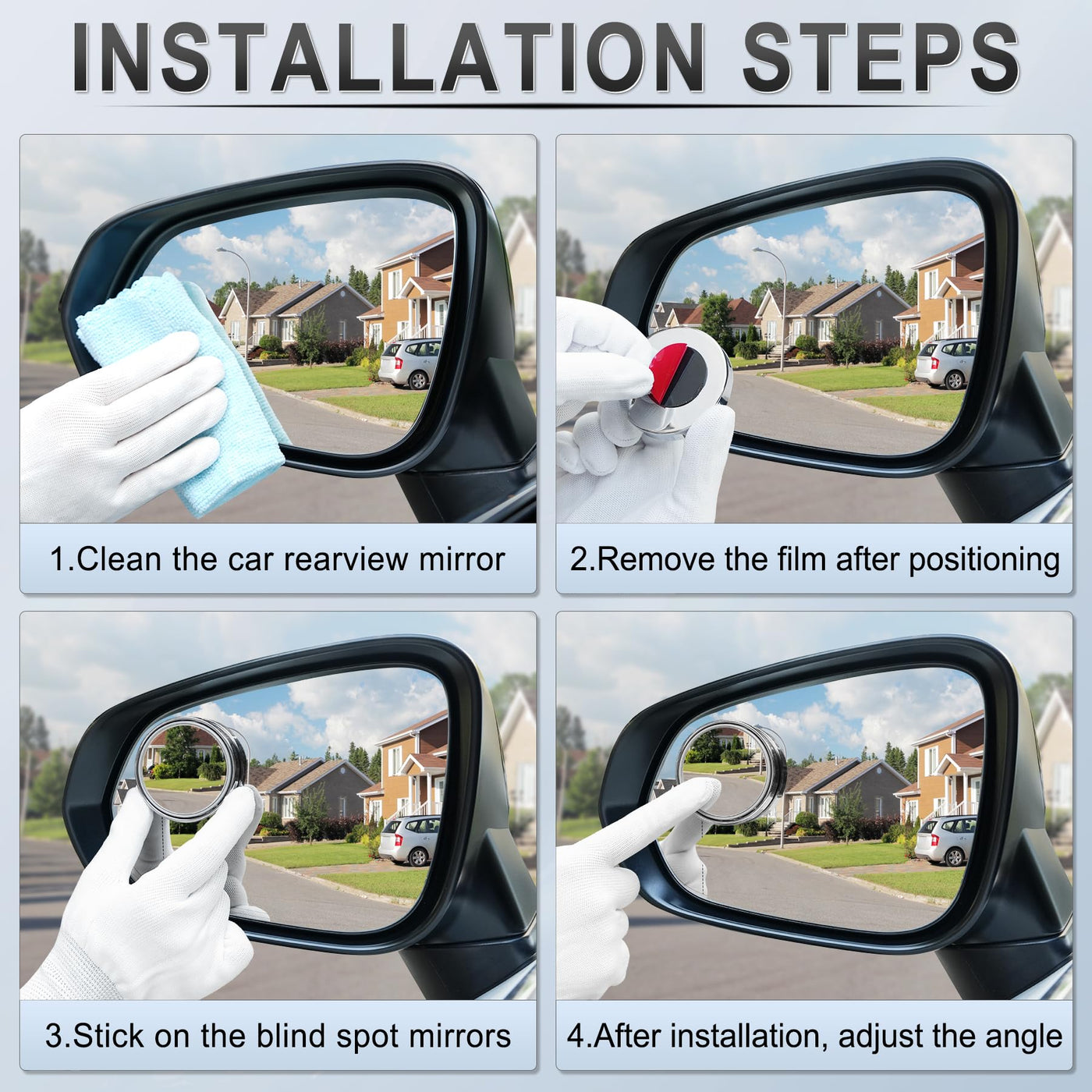 Blind Spot Auxiliary Mirror for Cars Made with high-definition glass, this auxiliary mirror offers clear visibility and is built to last, ensuring long-term use and reliability. Whether for daily commutes or long road trips, this mirror is an essential accessory for any driver. Product Features: -Wide-Angle HD Mirror: Offers a broader view, reducing blind spots and enhancing driving safety. -Easy Installation: No special tools required, installs in minutes. -Durable and Weatherproof: Constructed with high-quality materials, resistant to water and shock, ensuring durability. -Universal Fit: Suitable for various vehicle types including cars, SUVs, and trucks. Installation Instructions: 1.Select an appropriate installation position that does not obstruct the original side mirror view. 2.Attach the auxiliary mirror using the provided clip or adhesive. 3.Adjust the angle of the auxiliary mirror to cover the blind spot area. Note: 1.Ensure the auxiliary mirror is securely attached to prevent detachment during driving. 2.Regularly check the mirror's attachment to ensure it remains effective.