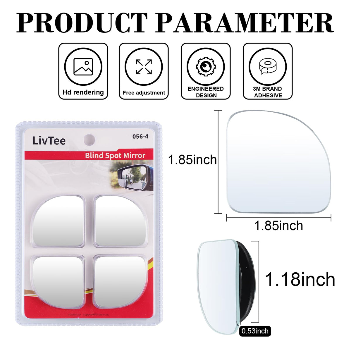 ?360 Degree?: 2 pieces packaged, newest upgrade 360 degree rotate and sway adjustable, maximize your view with wide angle in car. All convex spot mirrors are equipped with tiny adjustable swivel mounting bracket for easy installation. | ?More Safety?: Convex mirrors increase safety by eliminating blind spots for safer driving when passing and changing lanes on any road. Perfect for any Car, Van, SUV and Trucks. | ?HD Glass?: Our 2.5 ' ' HD Glass Curved Blind Spot Mirror is frameless and has a slim design, rust resistant, Convex ultra thin HD glass, no haze rear view side mirror. | ?Easy to install?: Pls clean your original car side mirro, then stick blind spot mirrors to the mounting bracket and install them on side rear view mirrors. | ?Service Guarantee?: Any issues or questions please feel free to contact us, we are always here to satisfy all of you.