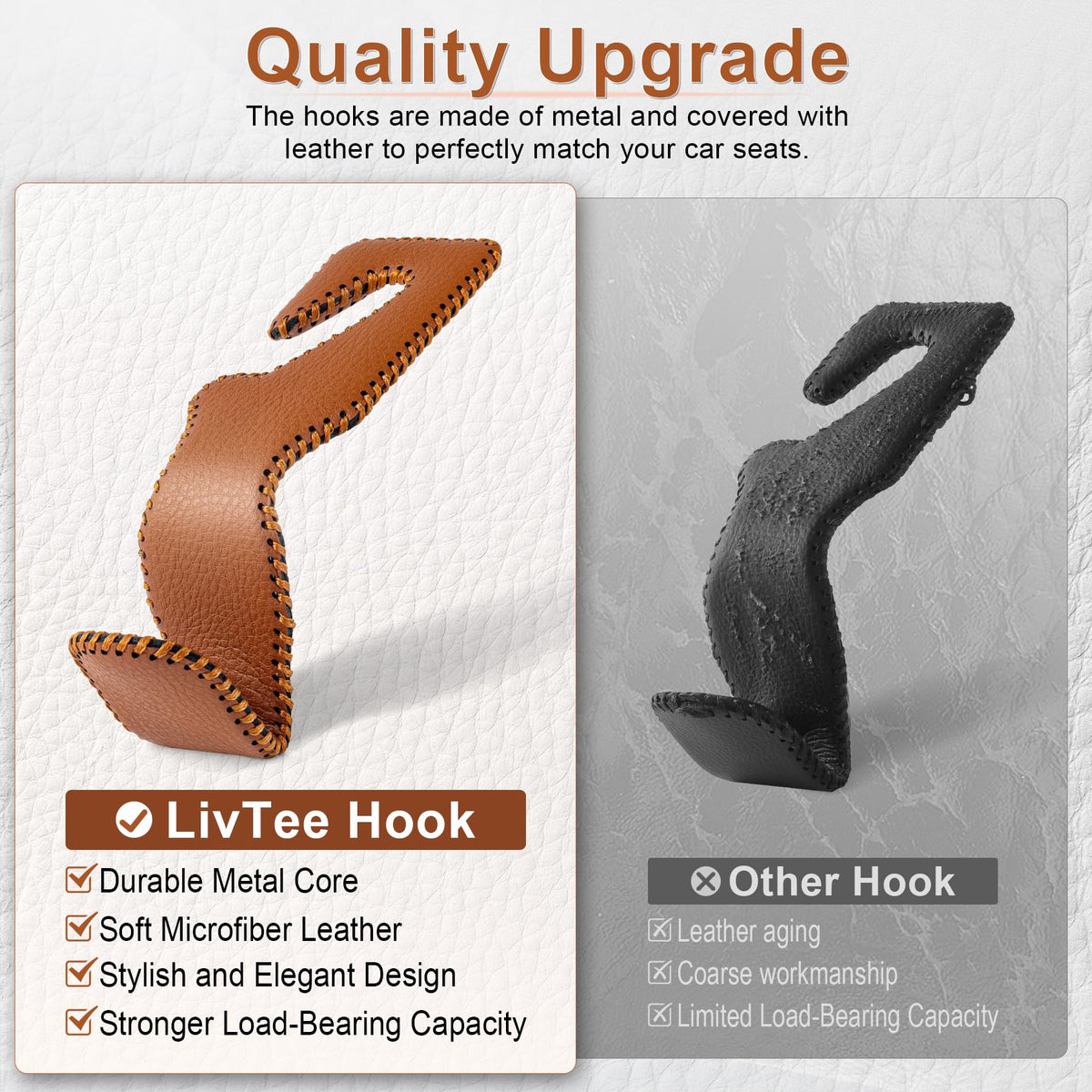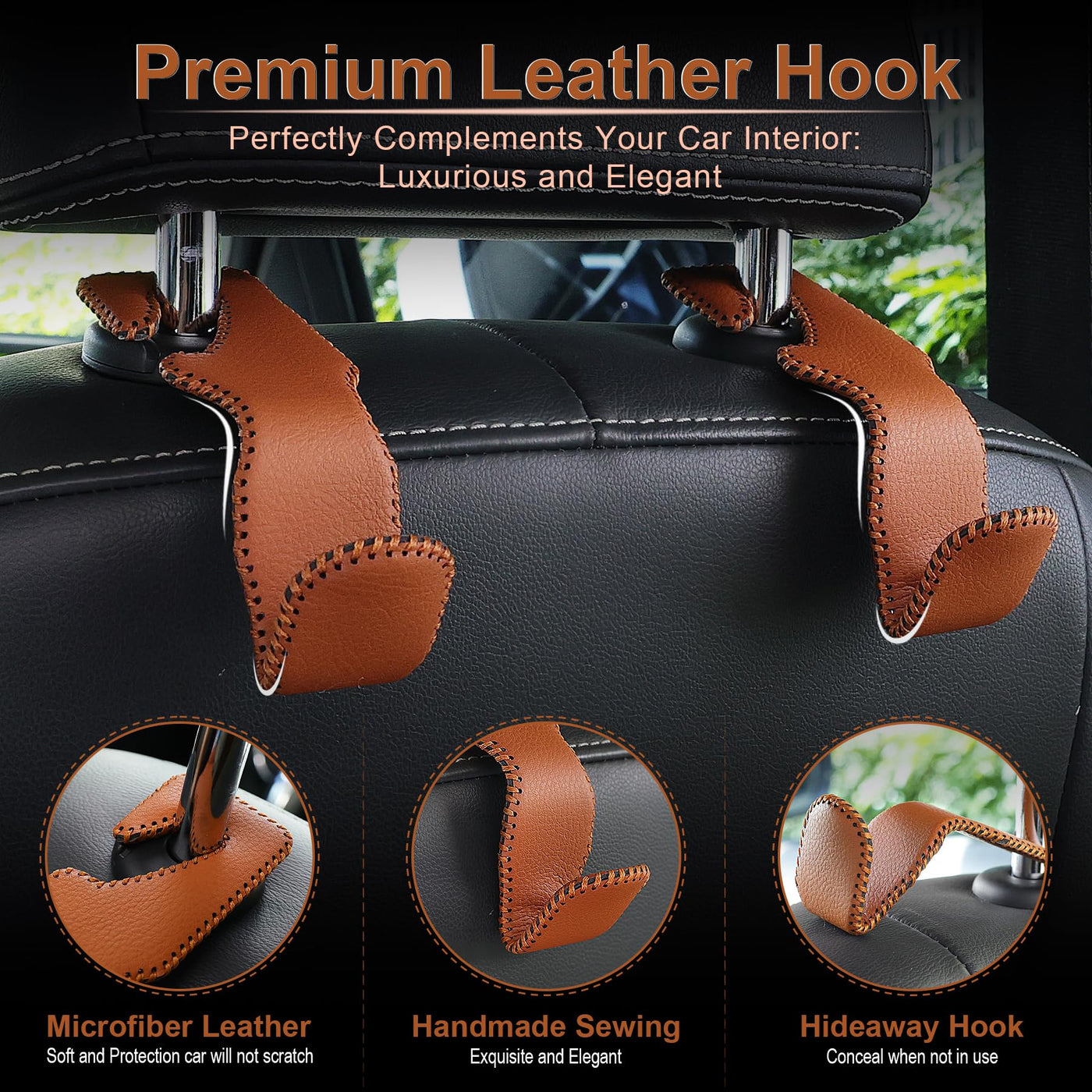 Livtee Brown Superior Leather Car Seat Back Headrest Hook, Auto Seat Hook Hangers Interior Accessories For Purse Coats Umbrellas