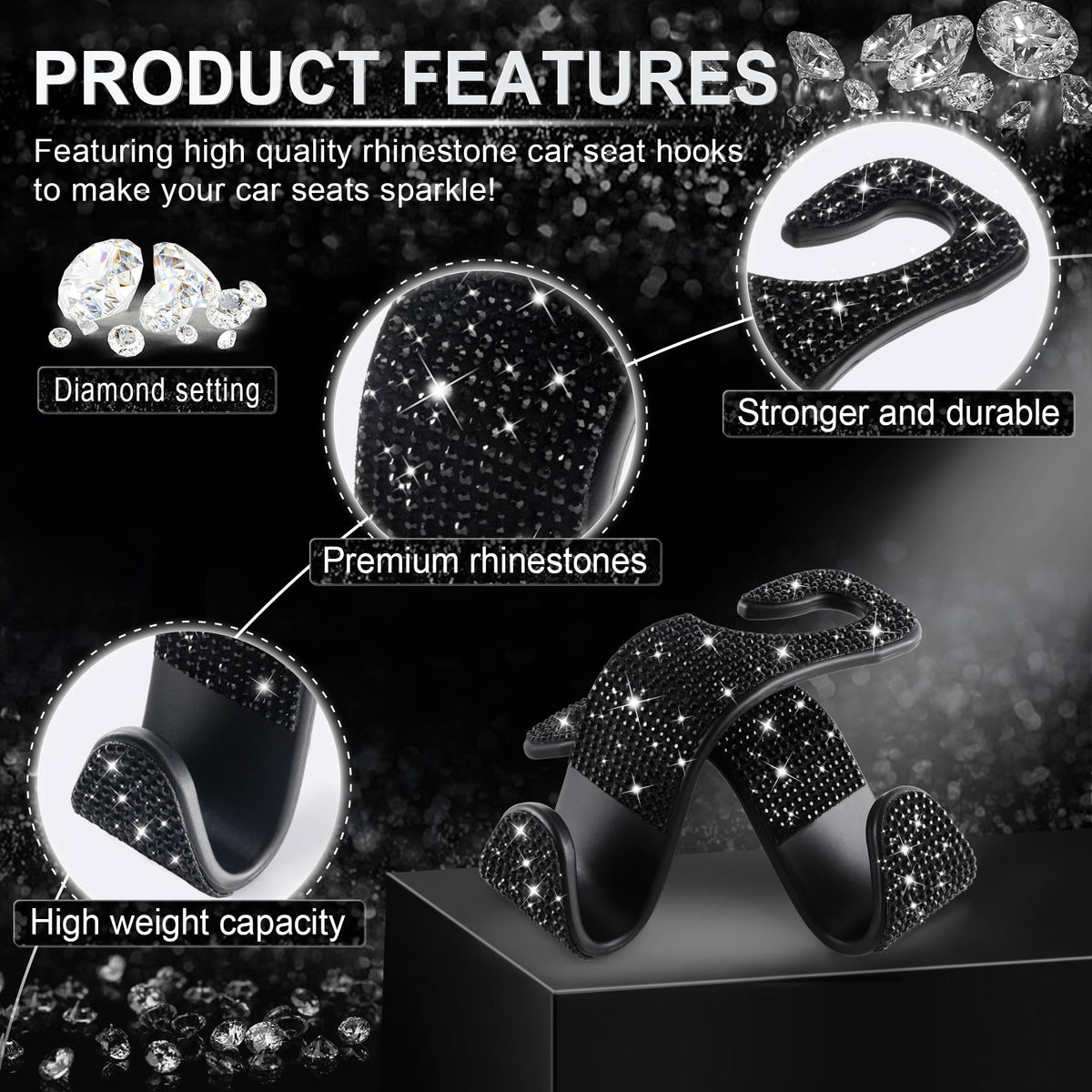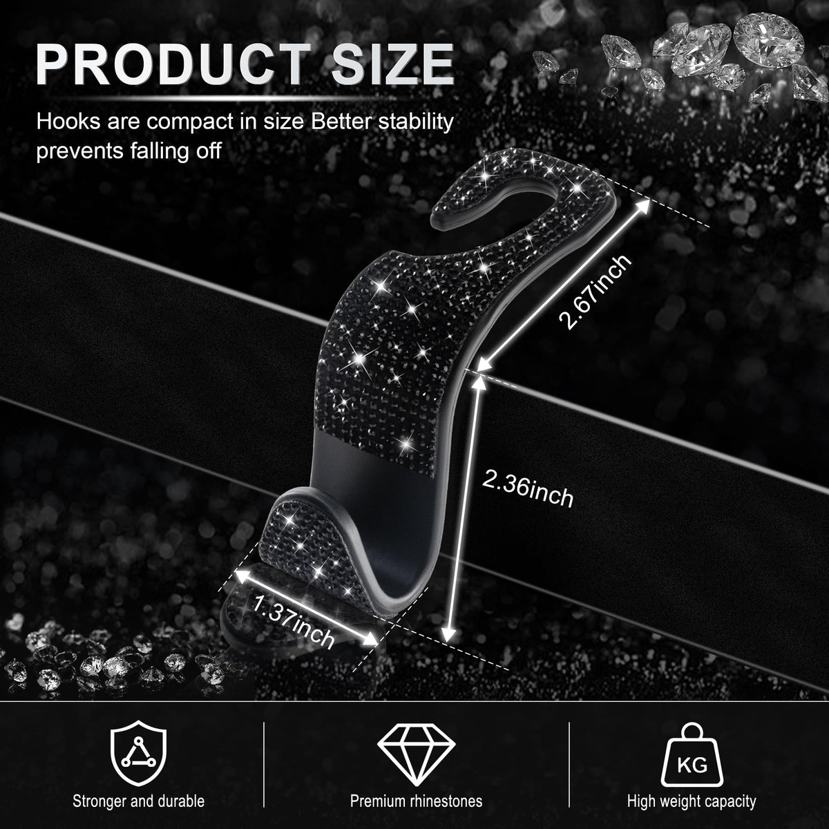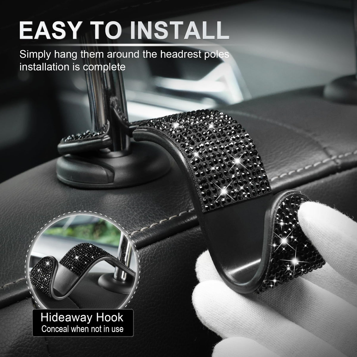 LivTee Crystal Bling Rhinestone Car Back Seat Headrest Hooks, Purse Bag Holder, Car Interior Accessories for Women and Men, 4-Pack (Black)
