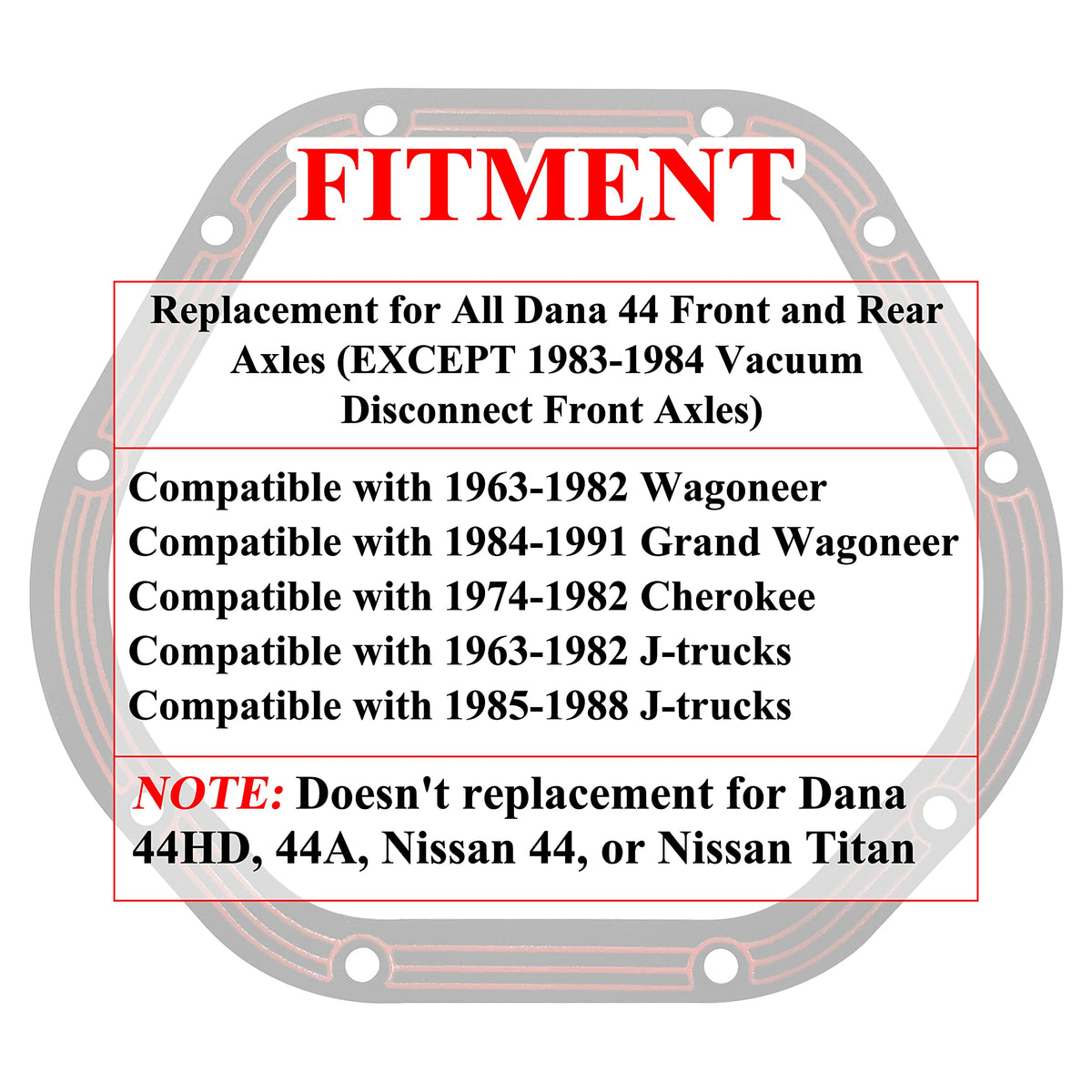 Q: Is the LLR-D044 gasket compatible with all Dana 44 axles?A: No, the LLR-D044 gasket is specifically designed for certain Dana 44 axles and is NOT a replacement for Dana 44HD, 44/226, 44A, or Nissan Titan models.