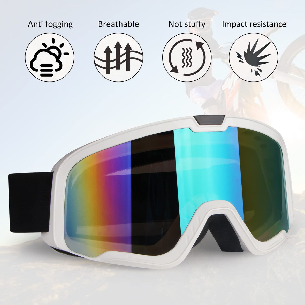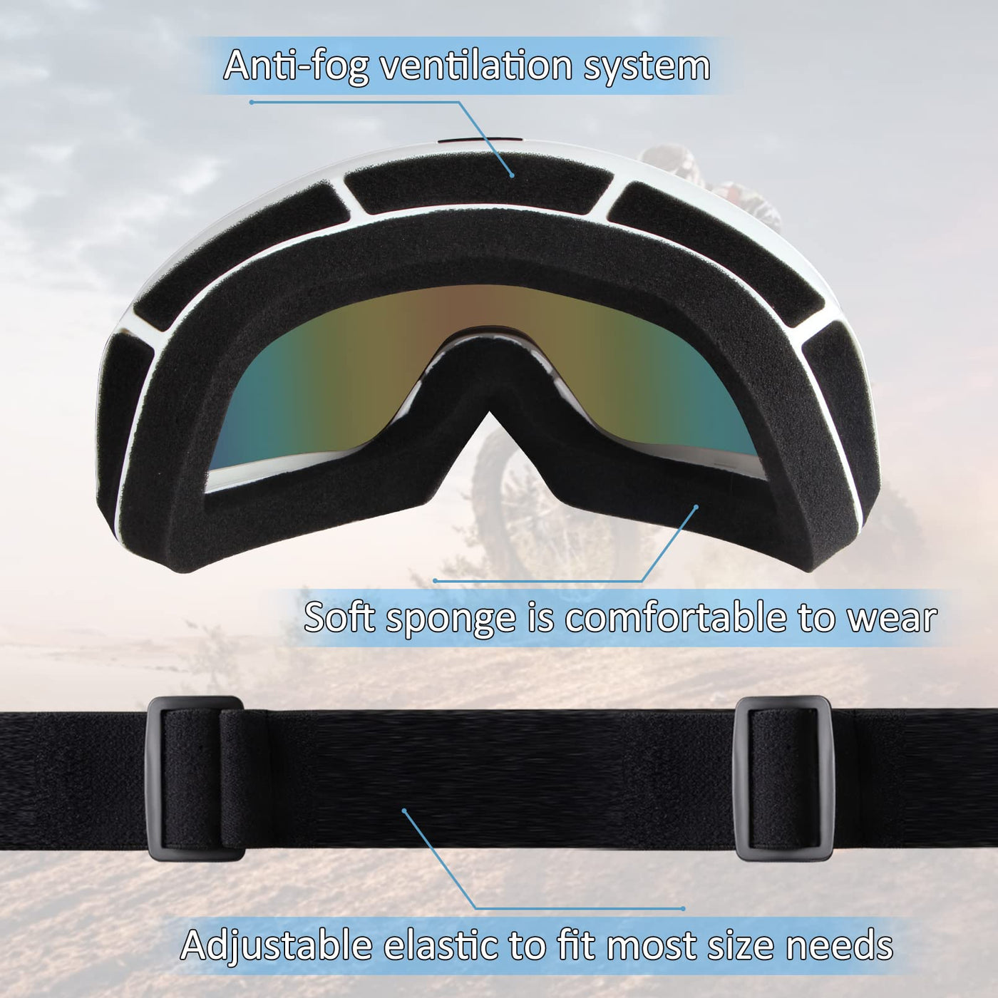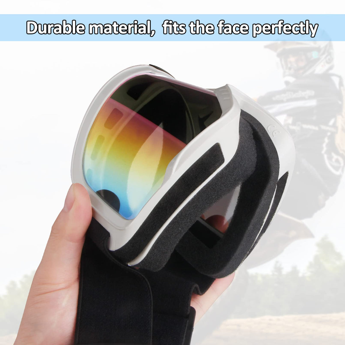 ?High-quality lens?The motocycle goggles is made of reinforced PC lens, with scratch-resistant and impact-resistant.The goggles lens is transparent and clear, Wide frame design, wide field of vision. | ?Excellent frame material?Goggles frame is made of more flexible PU material, flexible,very wear-resistant, light in weight, does not burden the head,very convenient to carry . | ?Excellent overall design?The soft foam of the motoecross goggles can fit most faces, provide excellent wind and sand resistance.The top and bottom of the frame are designed with single-layer foam vents, which provide air permeability and preventing sand.The ATV goggles can effectively wick away sweat and heat, not fog in the hot summer. Comfortable to wear. | ?Adjustable anti-skid belt?The motorcycle goggles wear an adjustable anti-skid belt, be easily adjusted and won't slip. This goggles can be used with various helmets to ensure your safety. | ?Multi-purpose?Riding goggles are excellent protective equipment and can be used as goggles for motorcycle, motorcross,ATV goggles mountain bikes, racing bicycles, powersport,MX goggles etc.