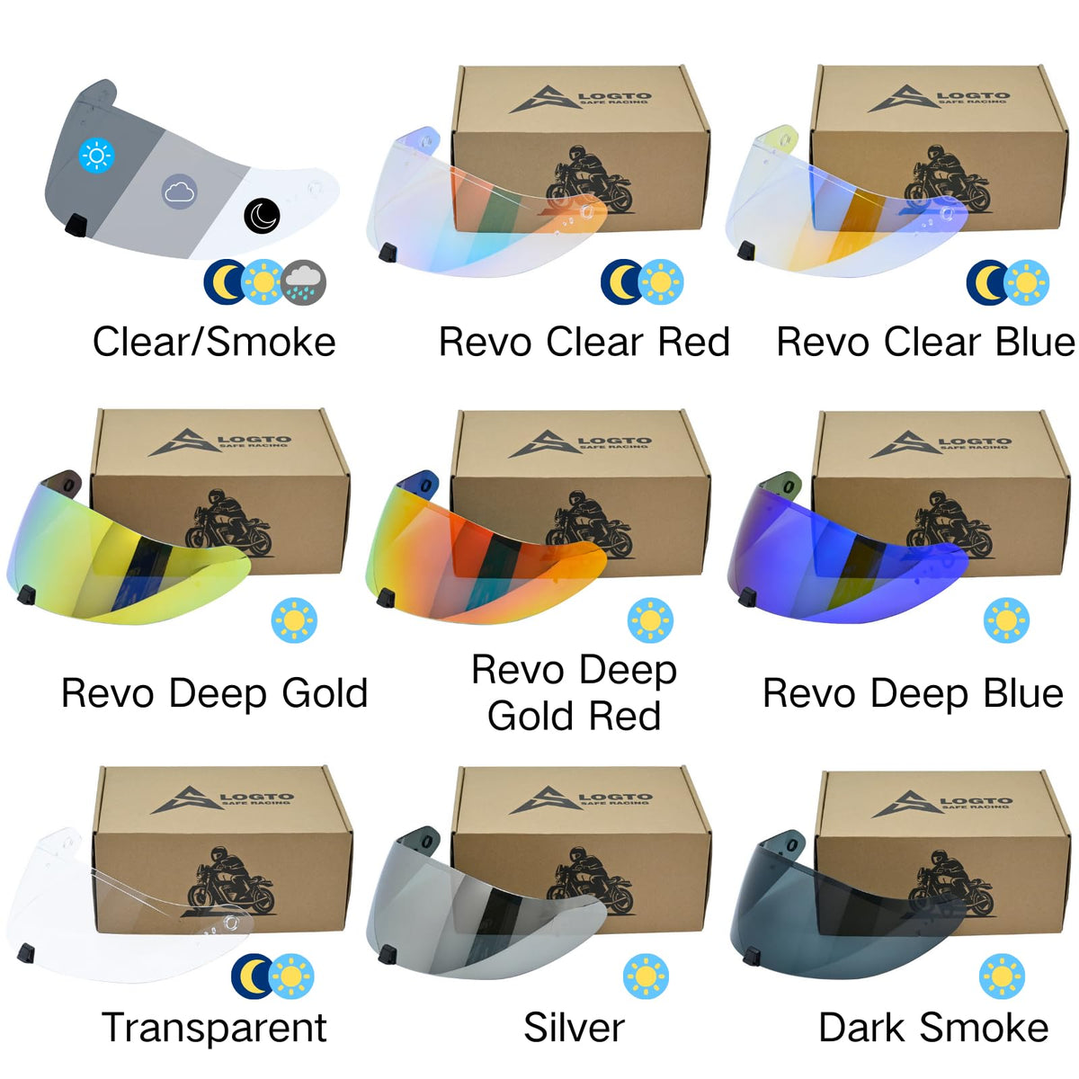 Q: What color options are available for the Logto motorcycle helmet visor?A: The Logto motorcycle helmet visor comes in several color options including Transparent, Dark Smoke, Silver, Revo Deep Blue, Revo Deep Gold, Revo Deep Gold Red, Revo Clear Blue, and Revo Clear Red. Choose the tint that best suits your riding conditions.