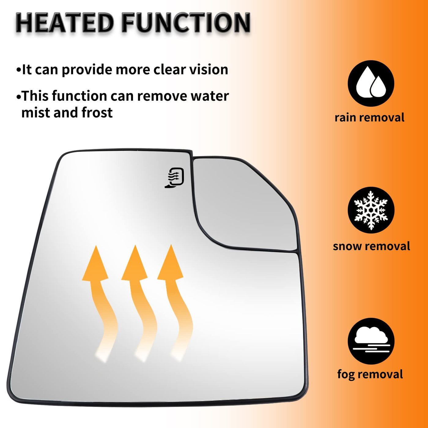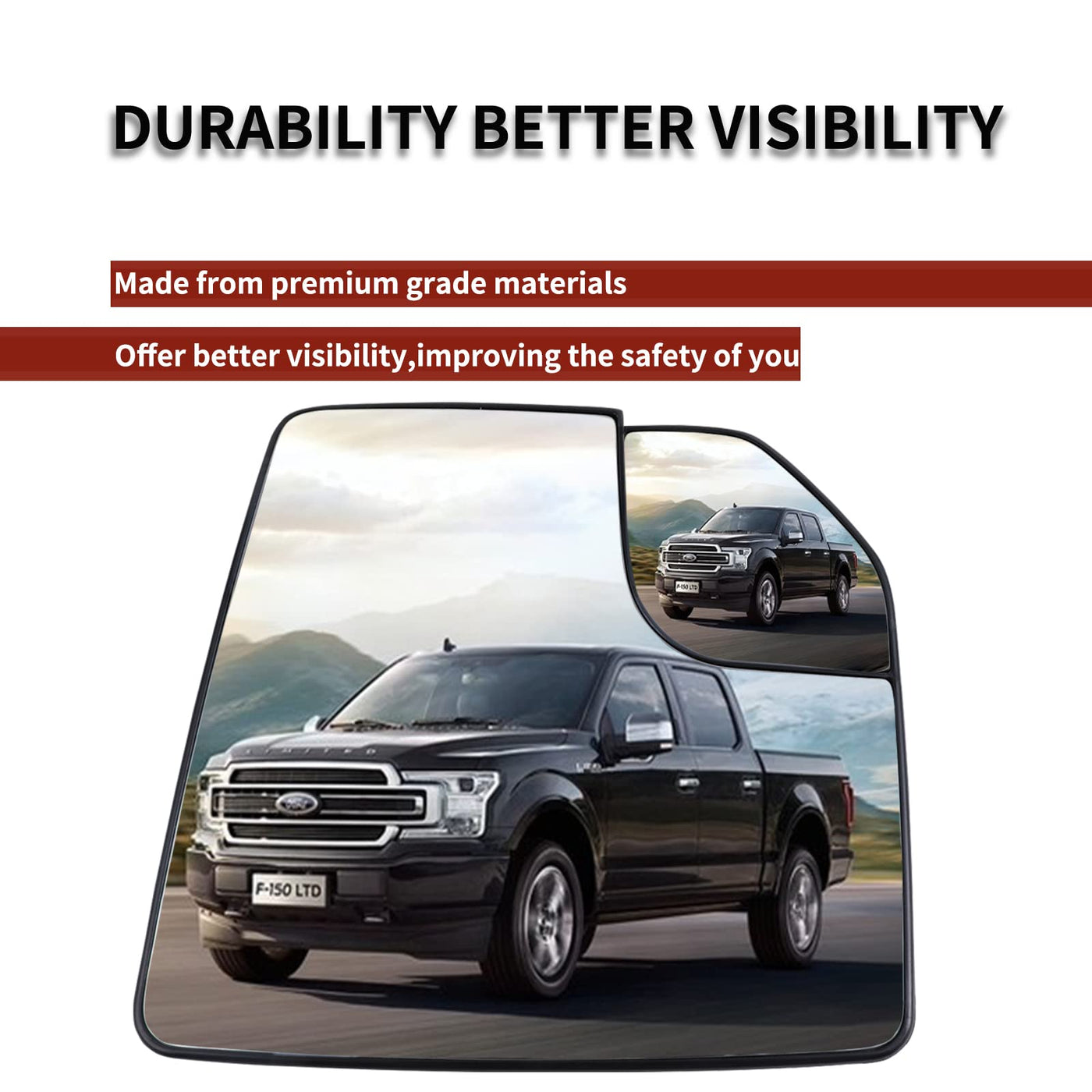 Fit Vehicle Range: Mirror Replacement for Ford F150 2015 2016 2017 2018 2019 2020 Passenger Side Mirror Glass Replacement for Ford F150 2015 2016 2017 2018 2019 2020 Replacement Part Number: (FL3Z-17K707-B) NOTE: When you choice The Heated Passenger Side Mirror Glass, please check your side mirror to make sure it fits. Features: OEM Design & Direct Replacement & Ensuring A Precise Fit Without Trimming.: This Passenger Side Mirror Replacement Glass is professionally designed as a direct replacement for Ford F150 2015 2016 2017 2018 2019 2020 Side View Passenger Mirror Glass Replacement. Better Glass Quality & Better Visibility: This Side Passenger Mirror Replacement is made of High Quality Glass & Acrylonitrile-Butadiene-Styrene (ABS) for clearer visibility, better durability and safety. Better glass brings a fog-free effect. Heated Mirror Glass Replacement The glass back of this passenger mirror replacement is designed with a heated function, which can eliminate fog and melt ice and snow by heating from the inside out. Easy Installation & You Can Complete The Replacement in A Few Minutes: The same mounting point as the factory mirrors glass. Completely suitable for existing wires and interfaces. Specification: Brand:LOIYLLEN Size :Passenger Side (Right) Lens Curvature Description:Convex Material:Glass & ABS(Acrylonitrile Butadiene Styrene) Replacement Part Number:(FL3Z-17K707-B) Package Includes: 1 X Passenger Side Convex Mirror Glass With Heated